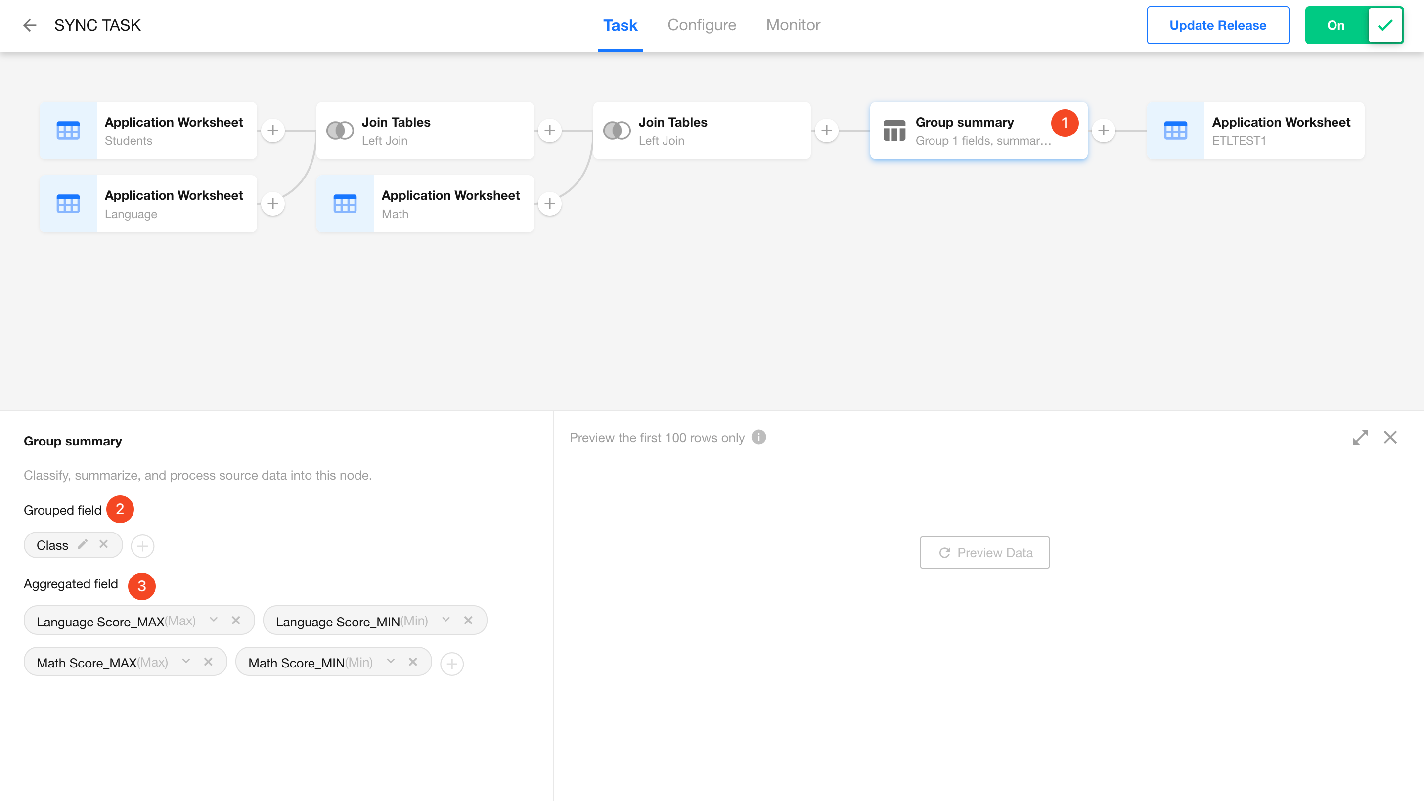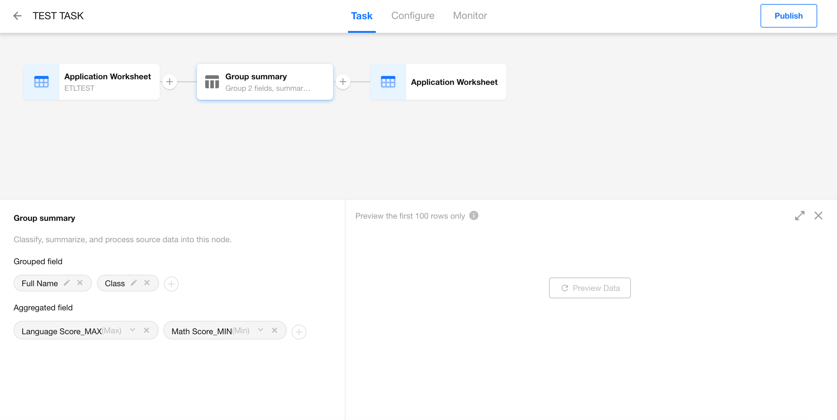 From any data sync task, hover between two nodes and click “+” to add a Group Summary node.