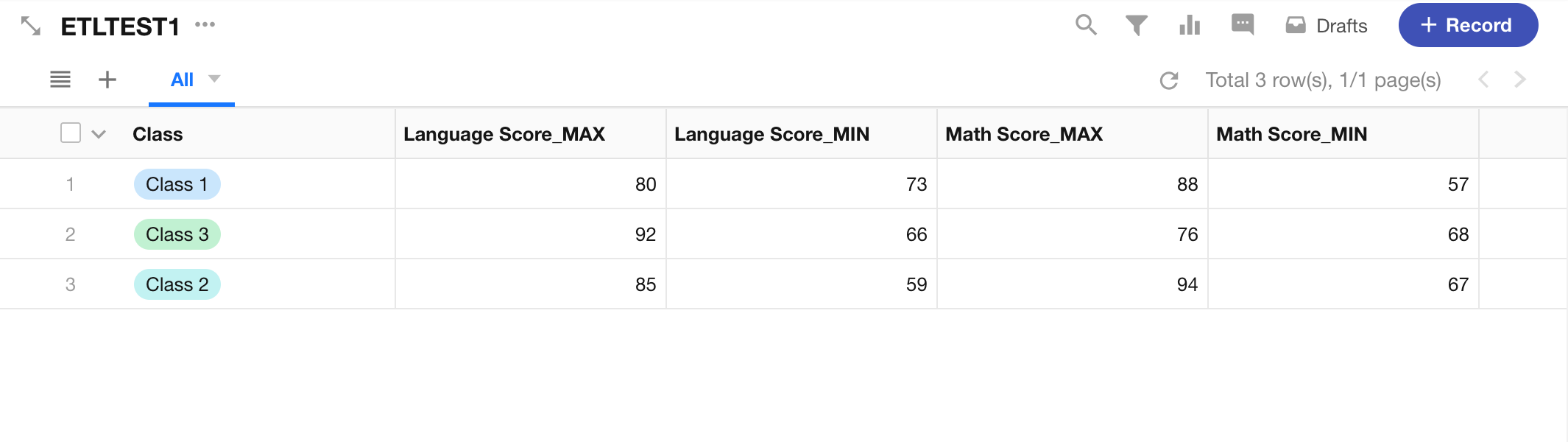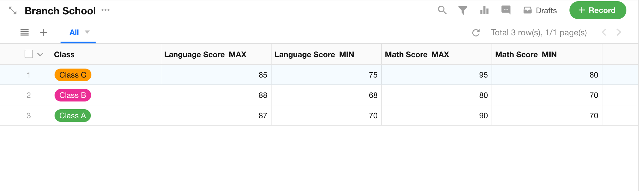 Using the result from a previous join operation, suppose we’ve added a Class field to the dataset. Now we want to group records by class and calculate the highest, average, and lowest scores for Language and Math.