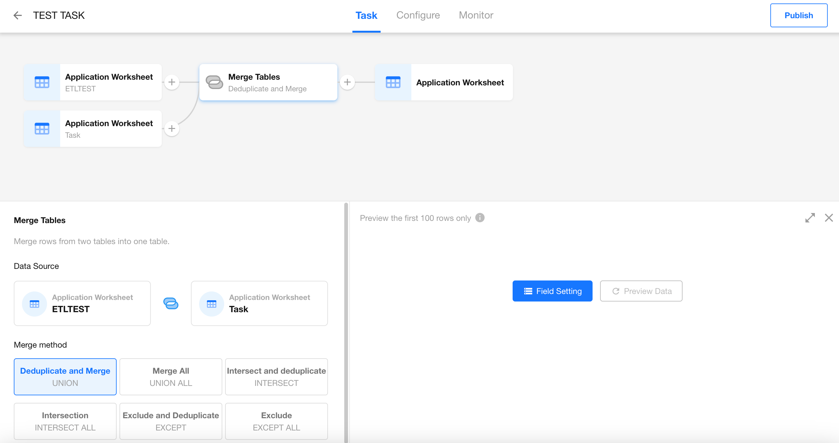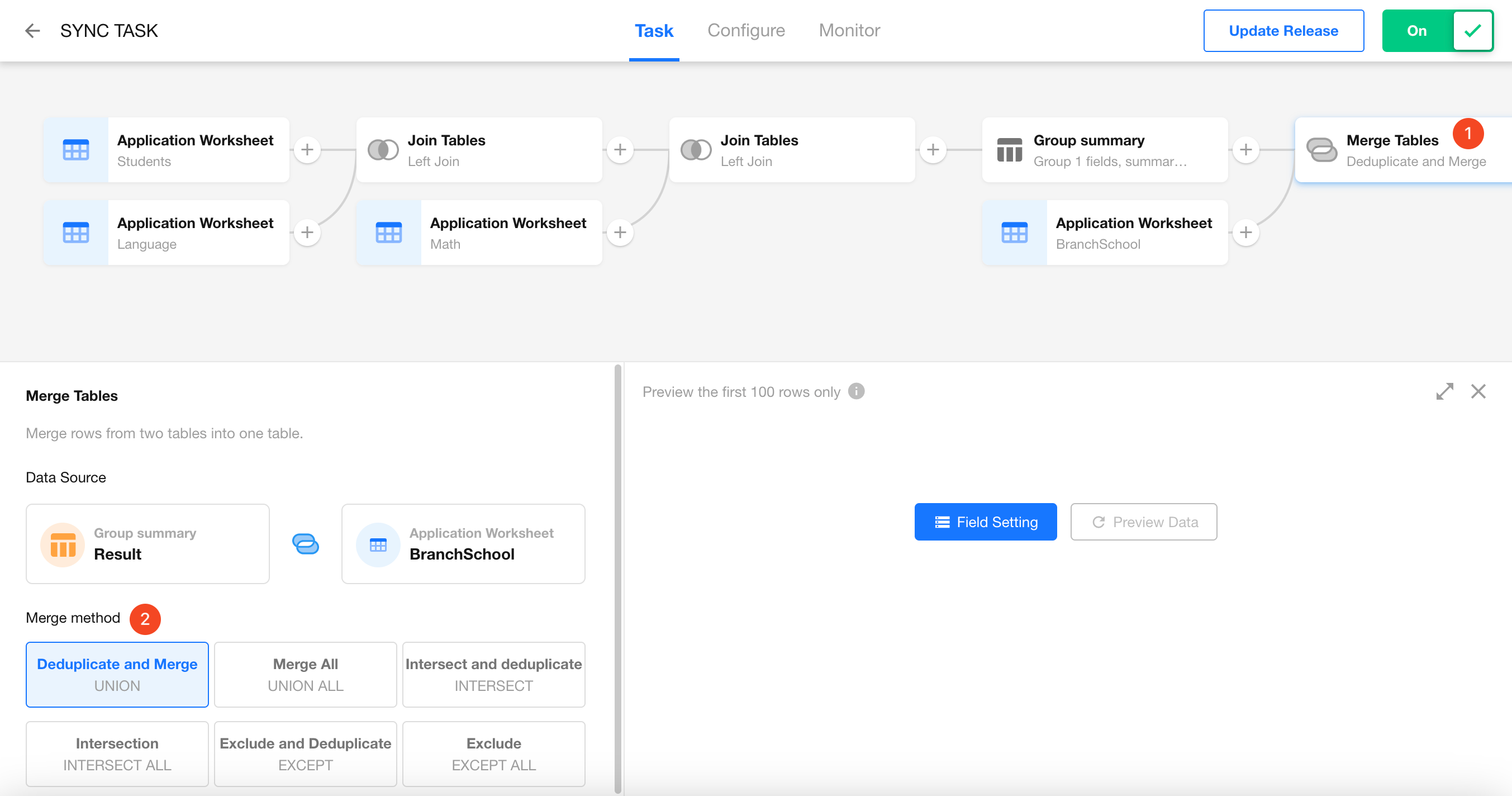 By using the Merge Tables node in a data sync task, you can simplify the process of merging data from multiple sources. This eliminates the need for separate queries and complex post-processing, increasing efficiency and maintainability for large-scale data integration tasks.