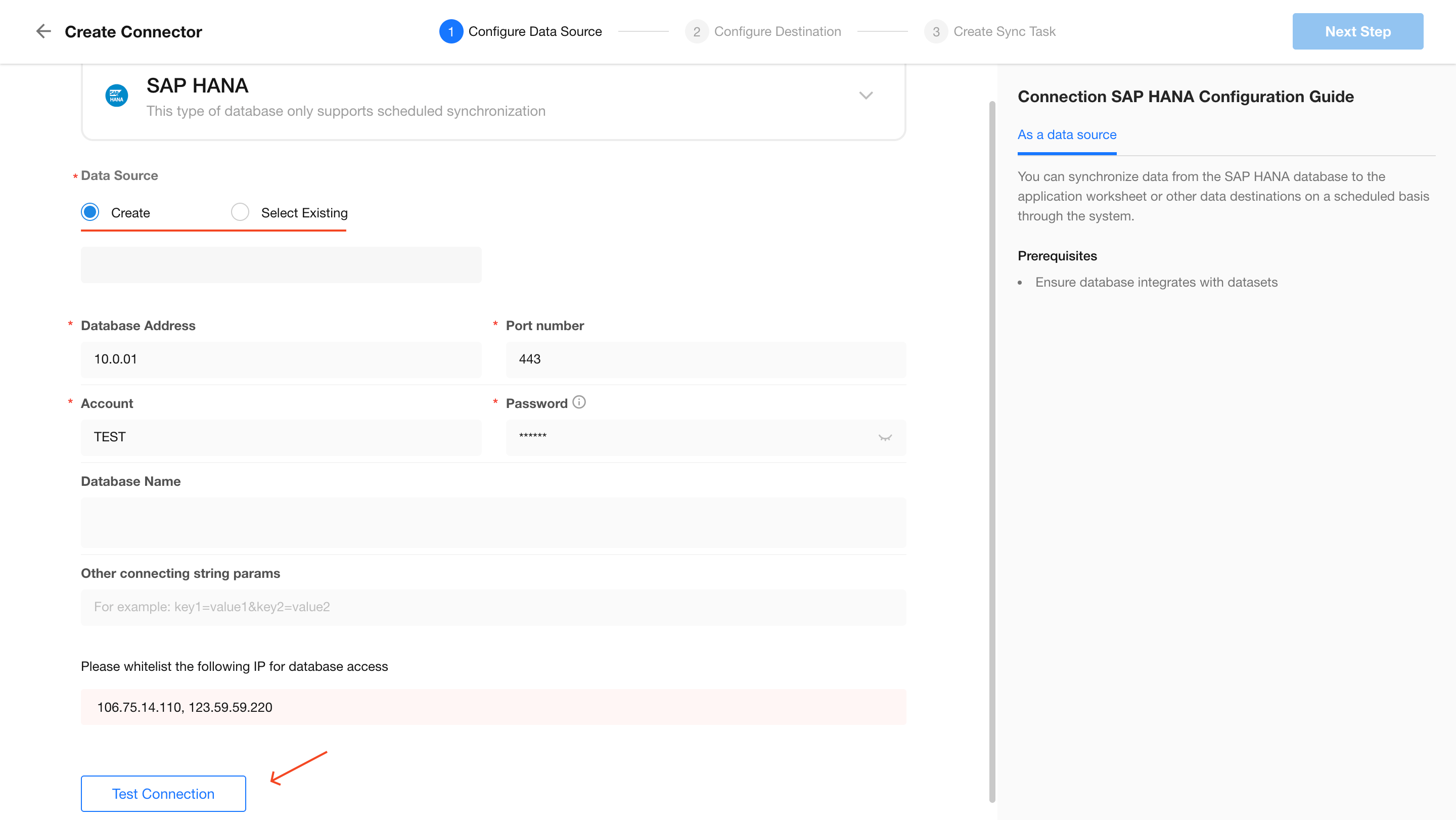 Create a new data source or select an existing one. Click Test Connection to verify, then click Next if the connection is successful.