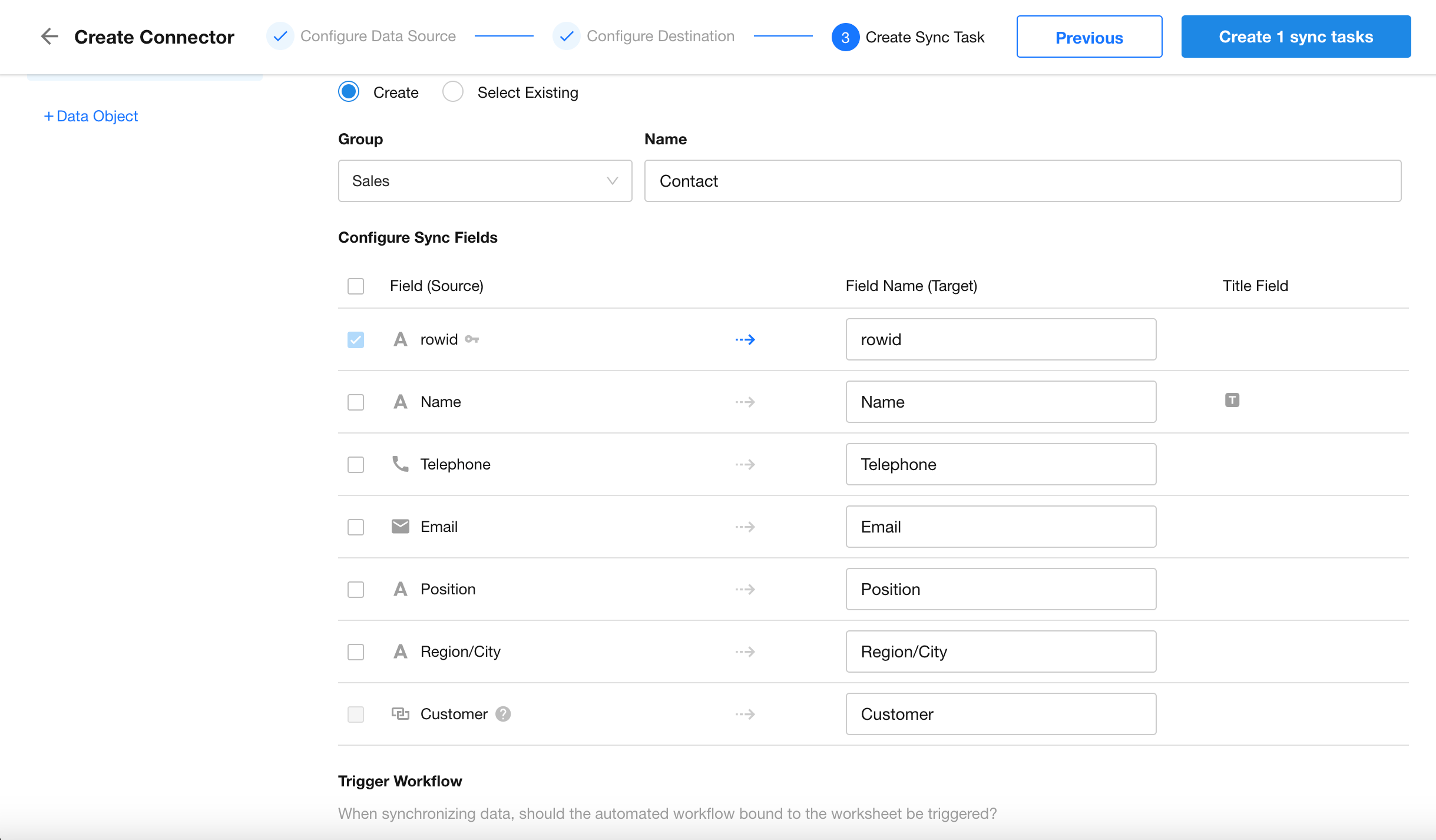 Define the field mappings and other configurations. Once done, click the Create Sync Task button at the top right.