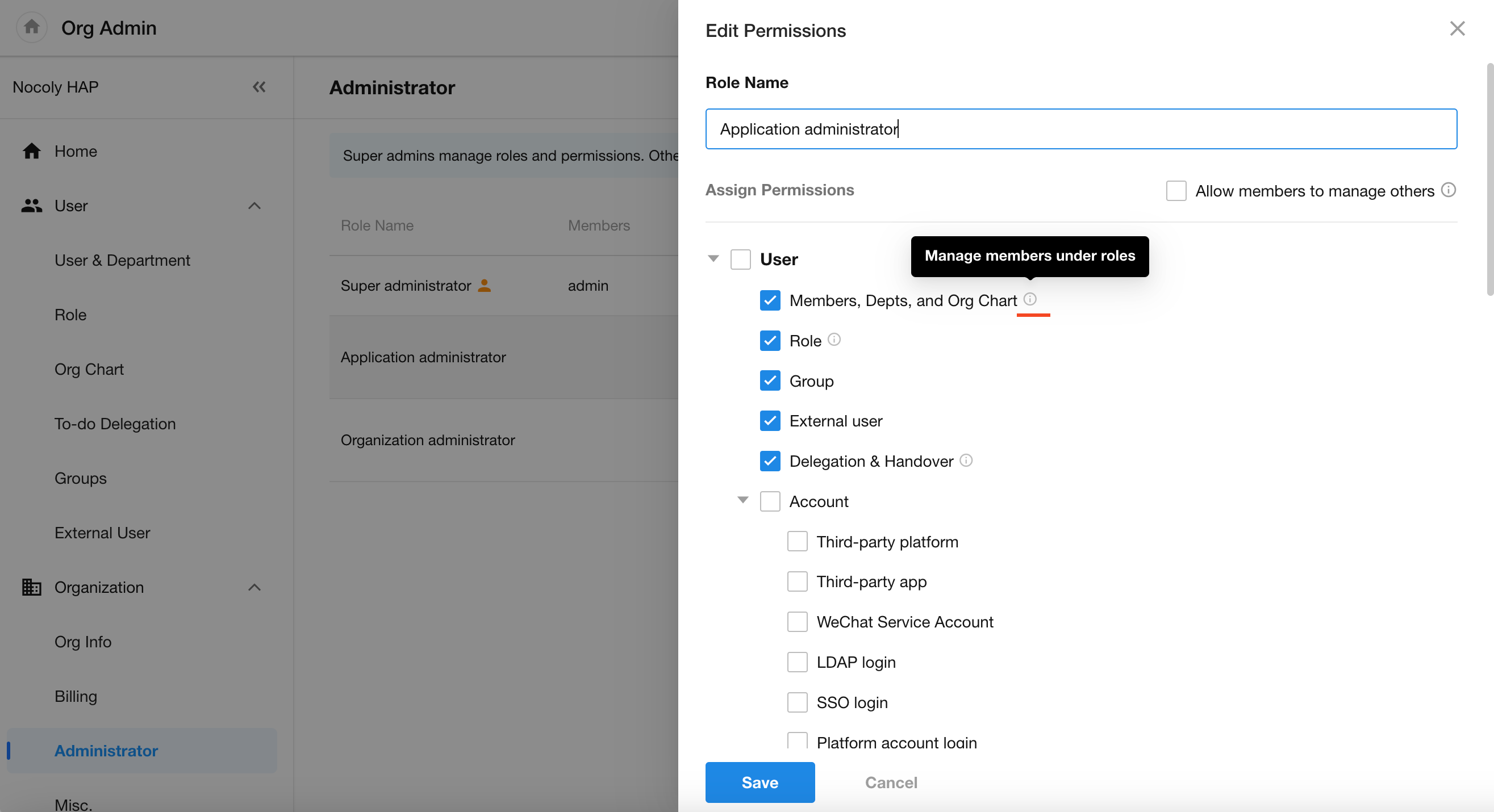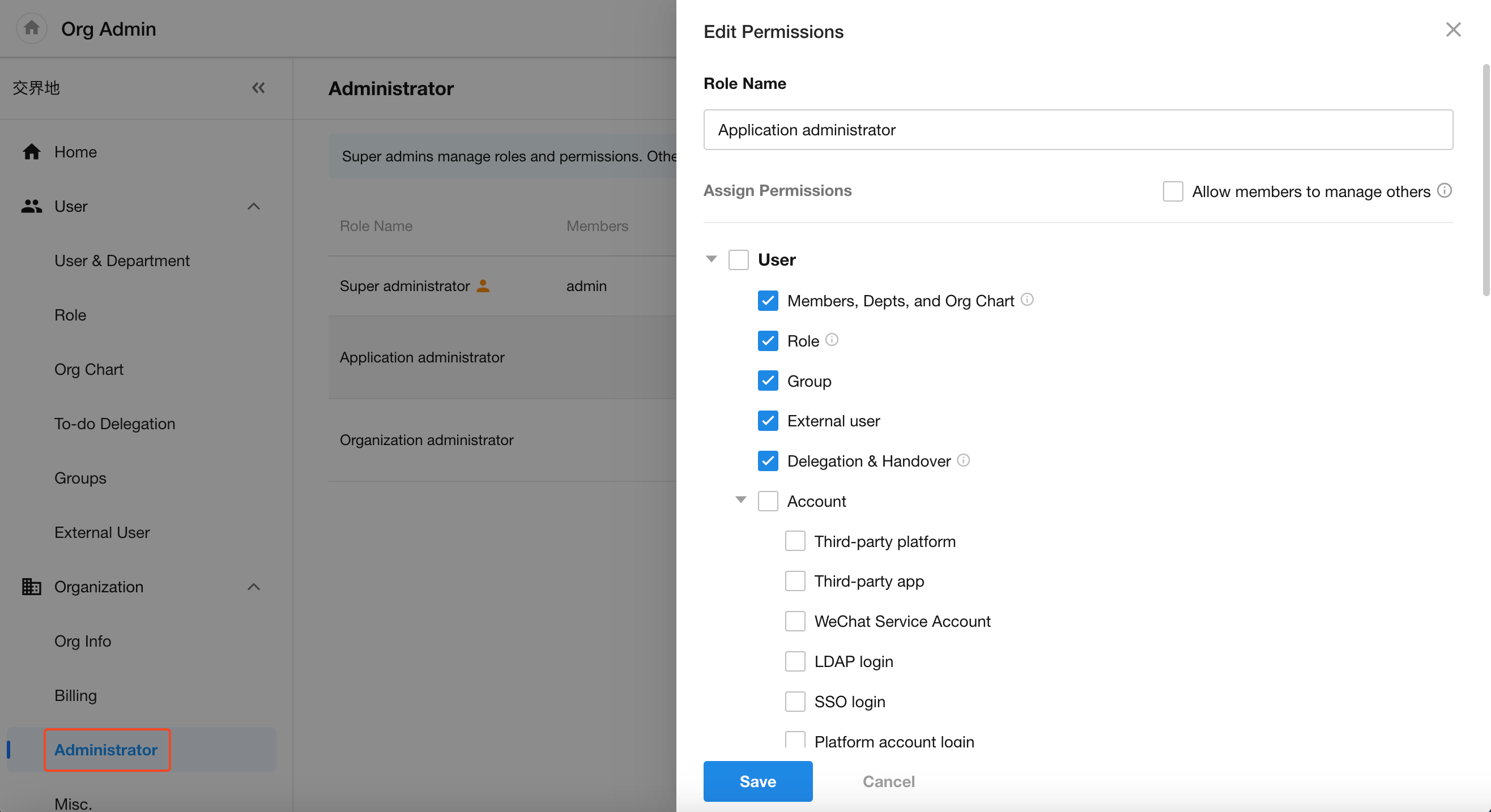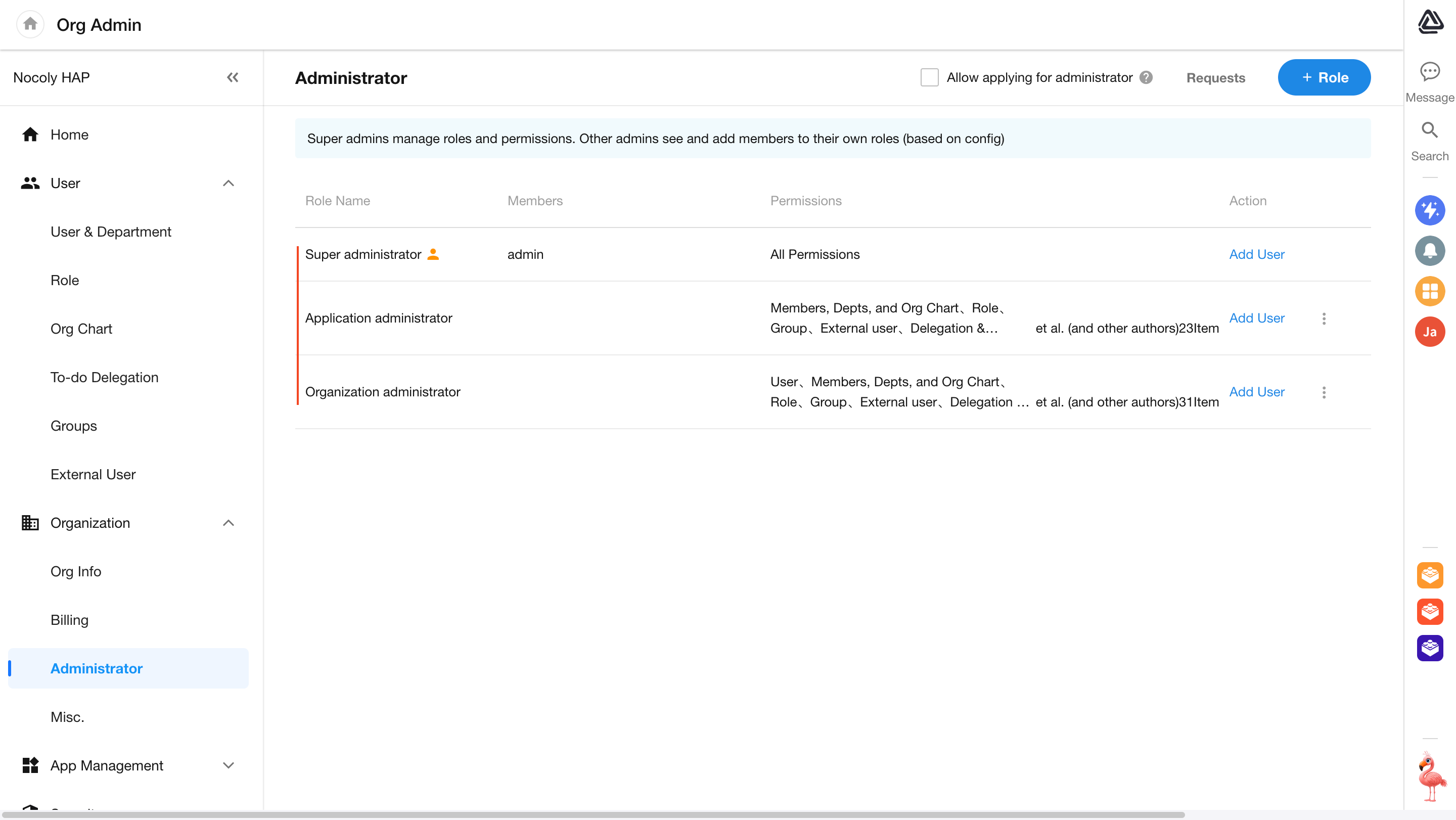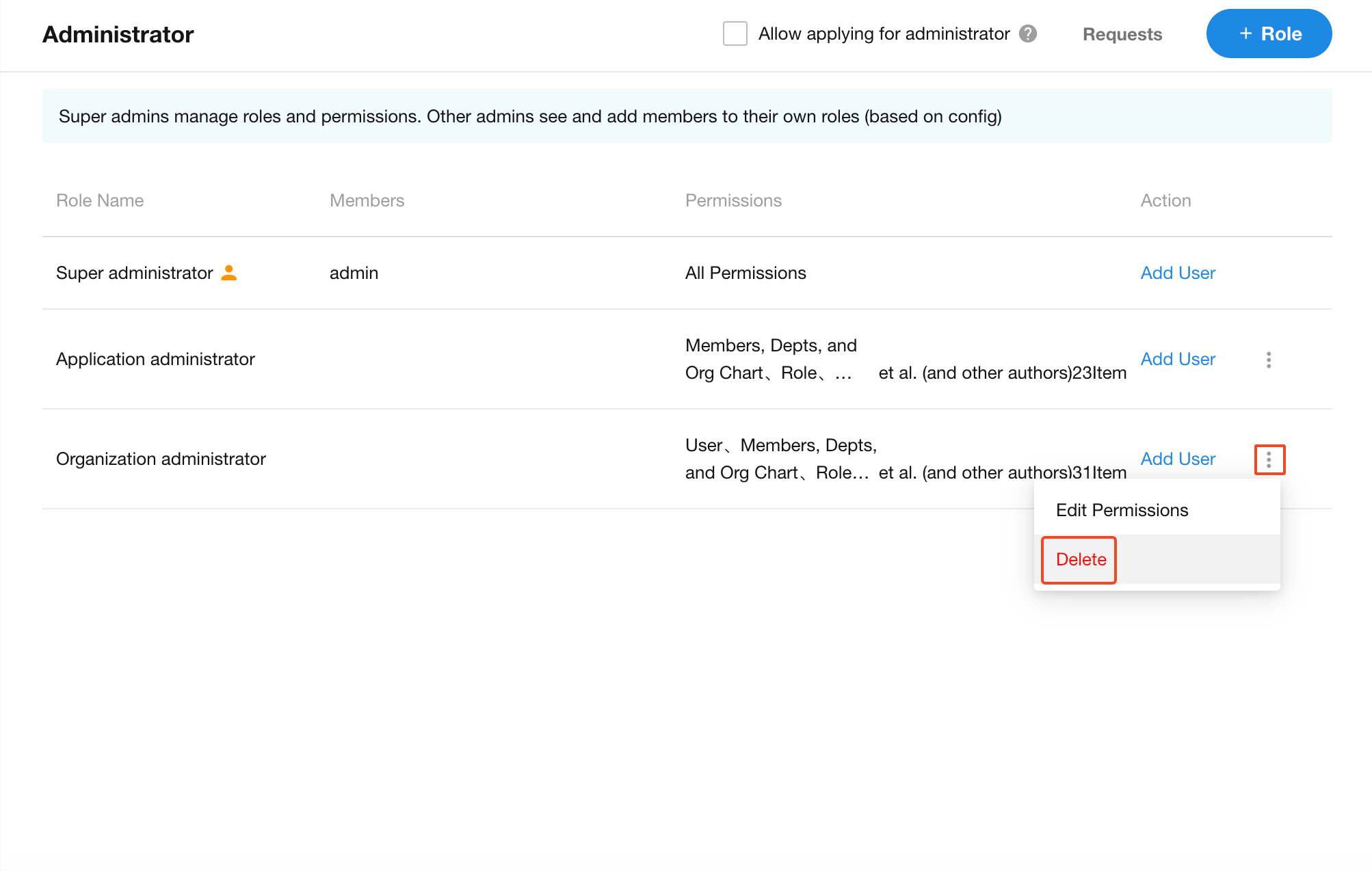 The super administrator has management permissions for all modules in the organization, the permissions cannot be modified, the role cannot be deleted, and only members can be added or removed. The organization creator is a super administrator by default. Members who are not super administrators do not see this role in the role list.