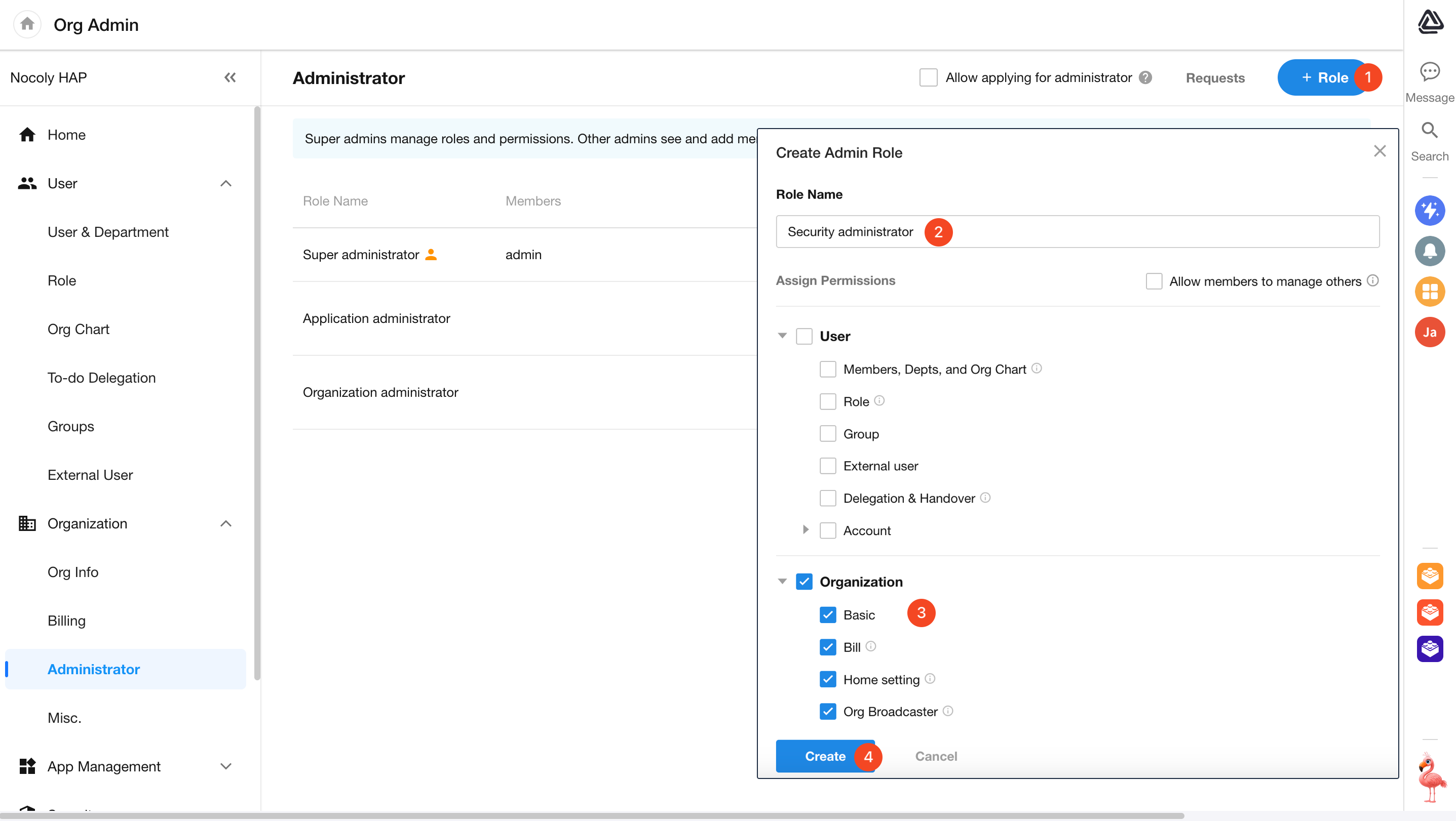 The super administrator can create, modify and delete custom roles, customize the permissions, manage the members of the role, and so on.