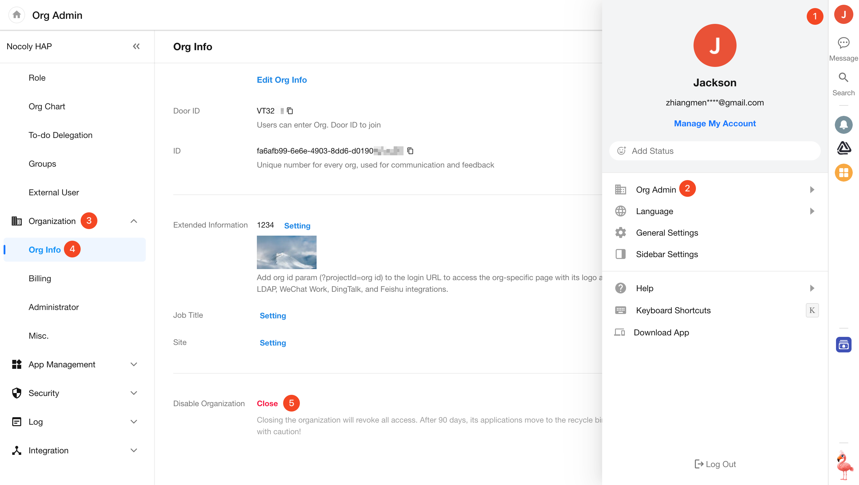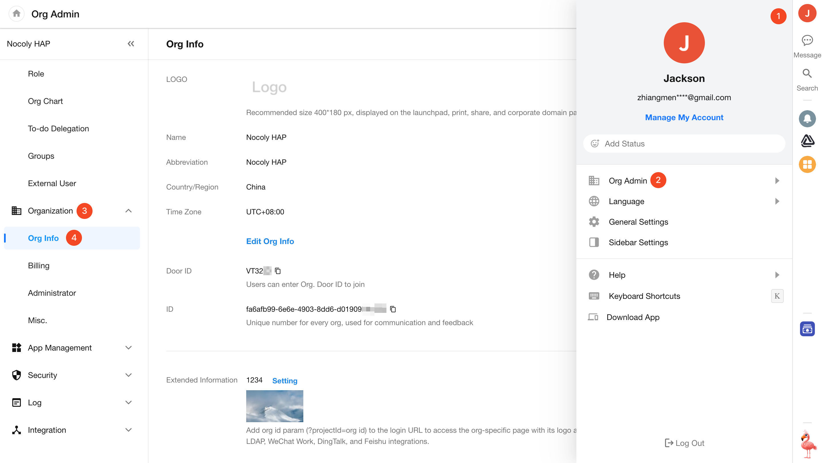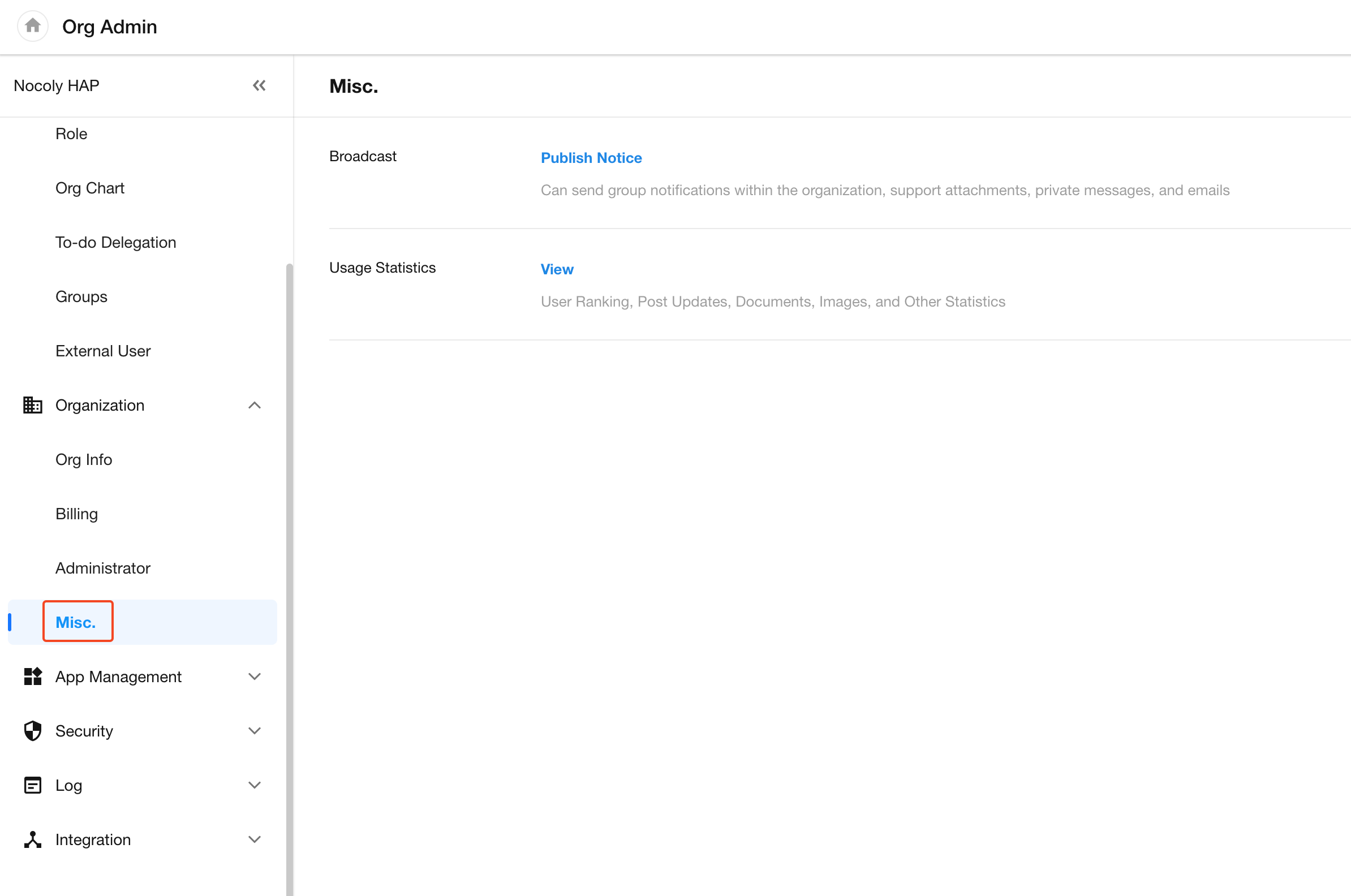 Organization Admin can go to [Org Admin] > [Organization] to set the organization's basic information, billings, and administrators. They can also post announcements, export tasks and posts.