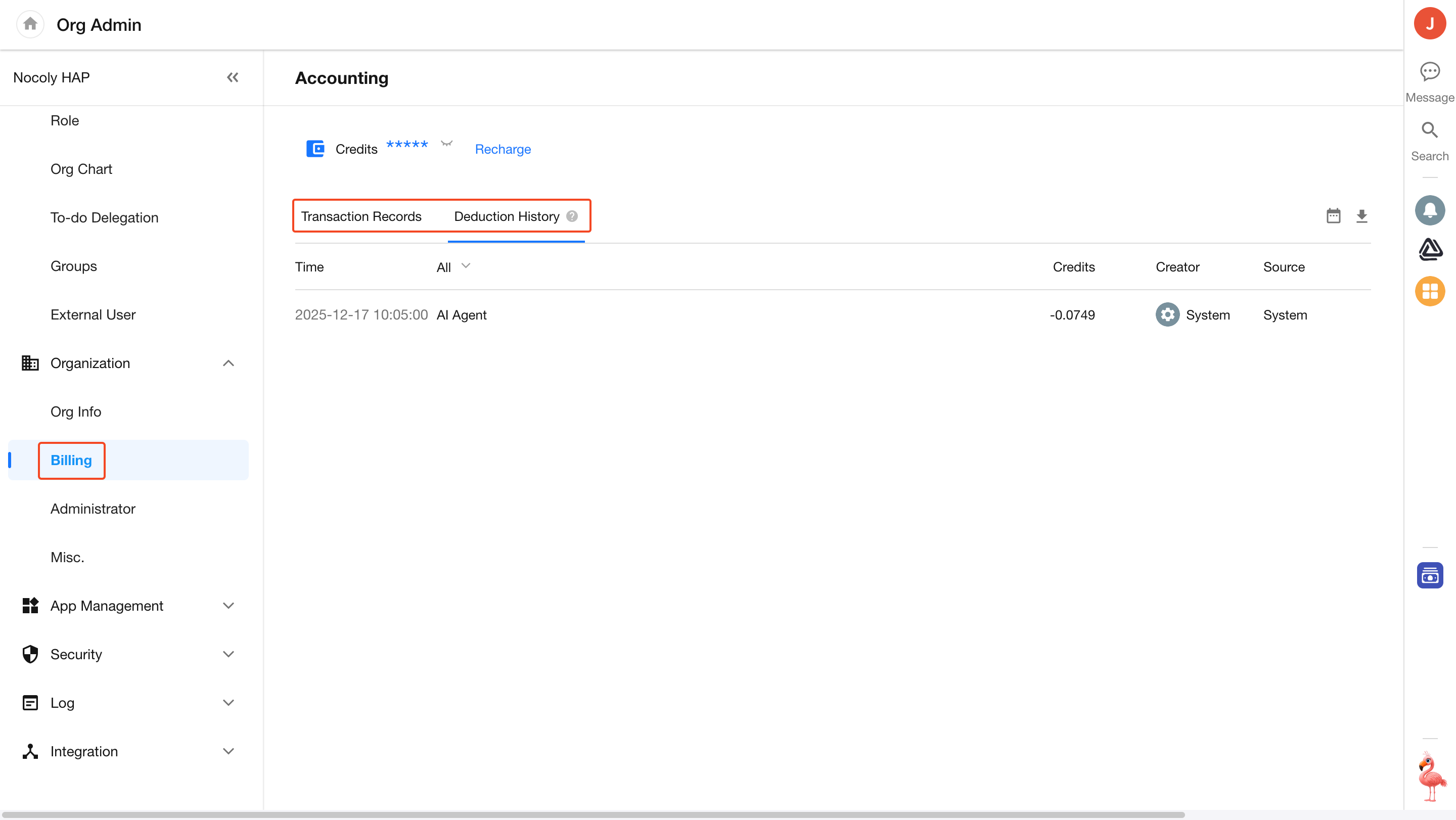 In the billing module, all recharge and consumption history is recorded. Here, users can recharge credits.