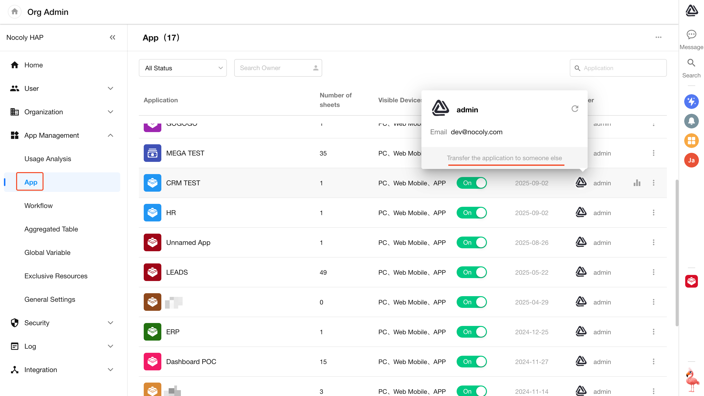 - If the employee is the owner of any app, ownership will automatically transfer to the Assistant. You can later reassign ownership to another member from the [Org Admin] > [App Management] > [App] section.