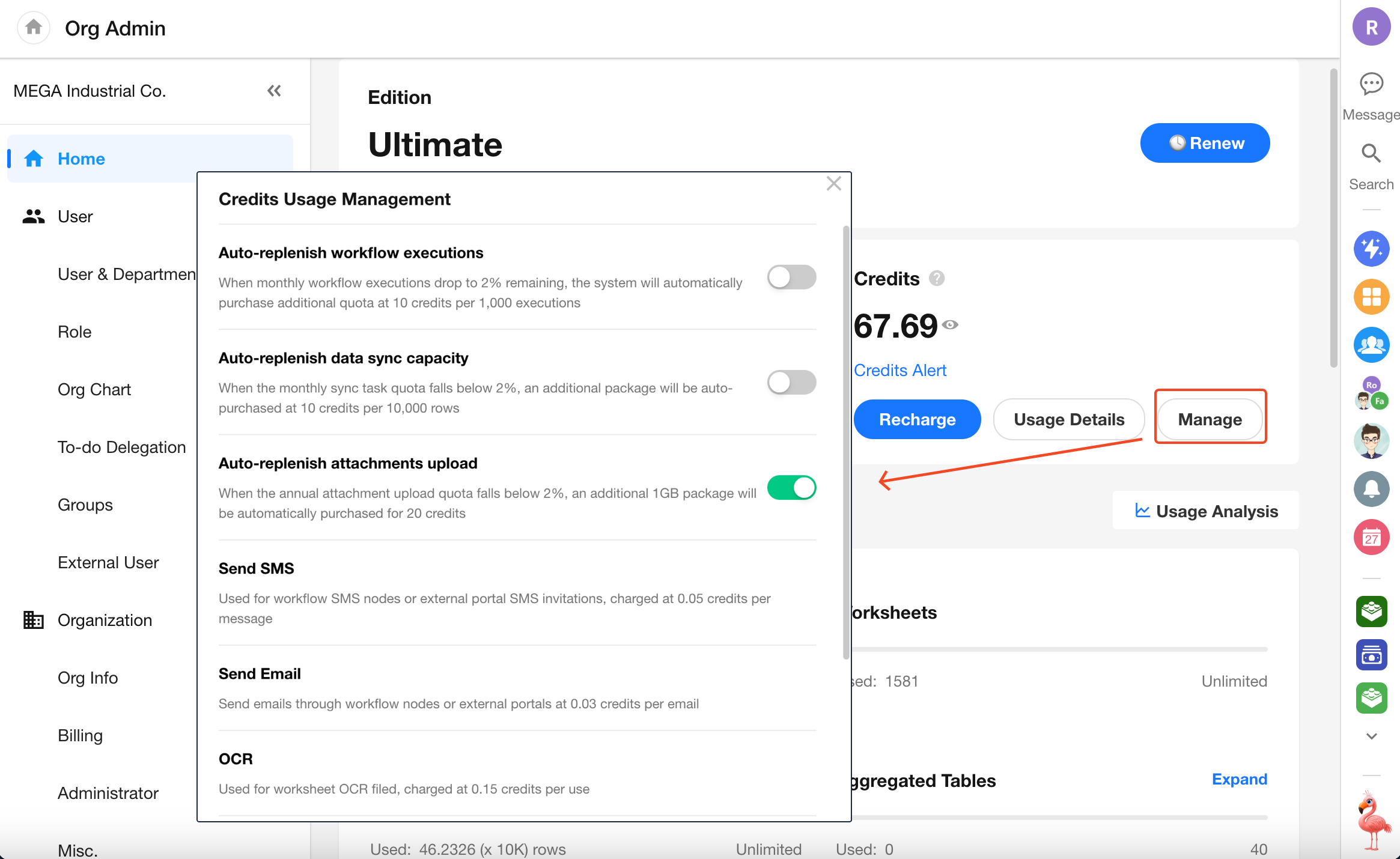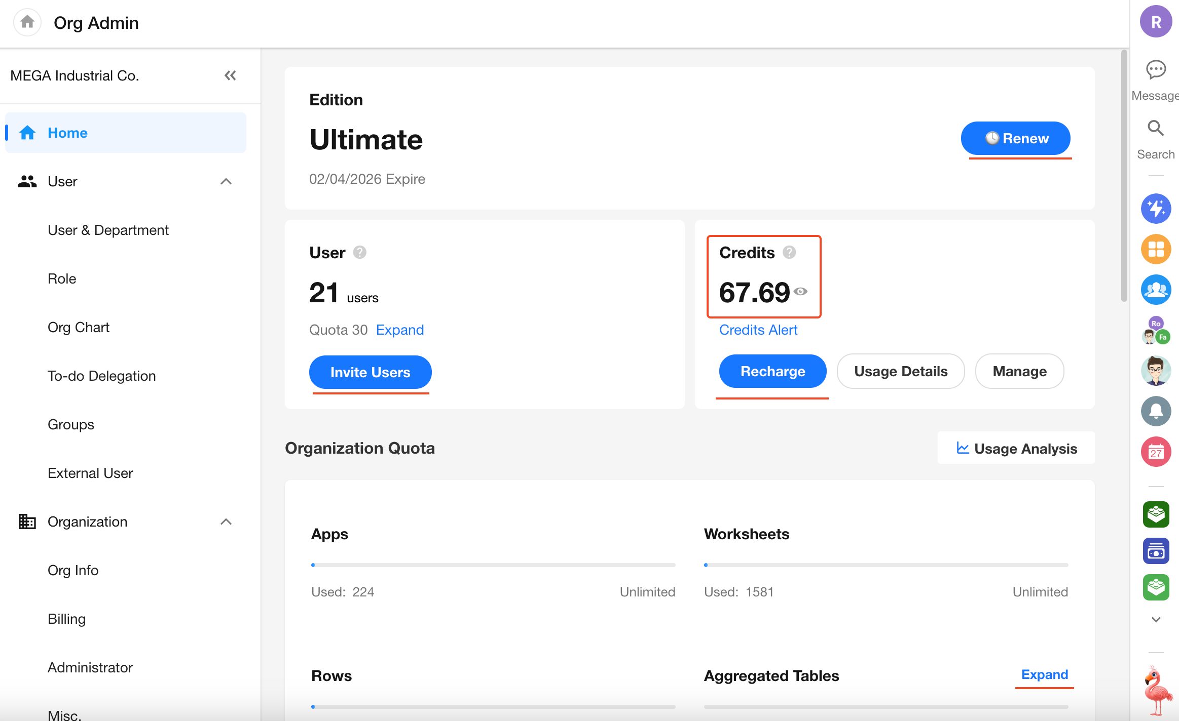 On the Organization Management homepage, you can view the usage details of various modules and access related configuration entries.