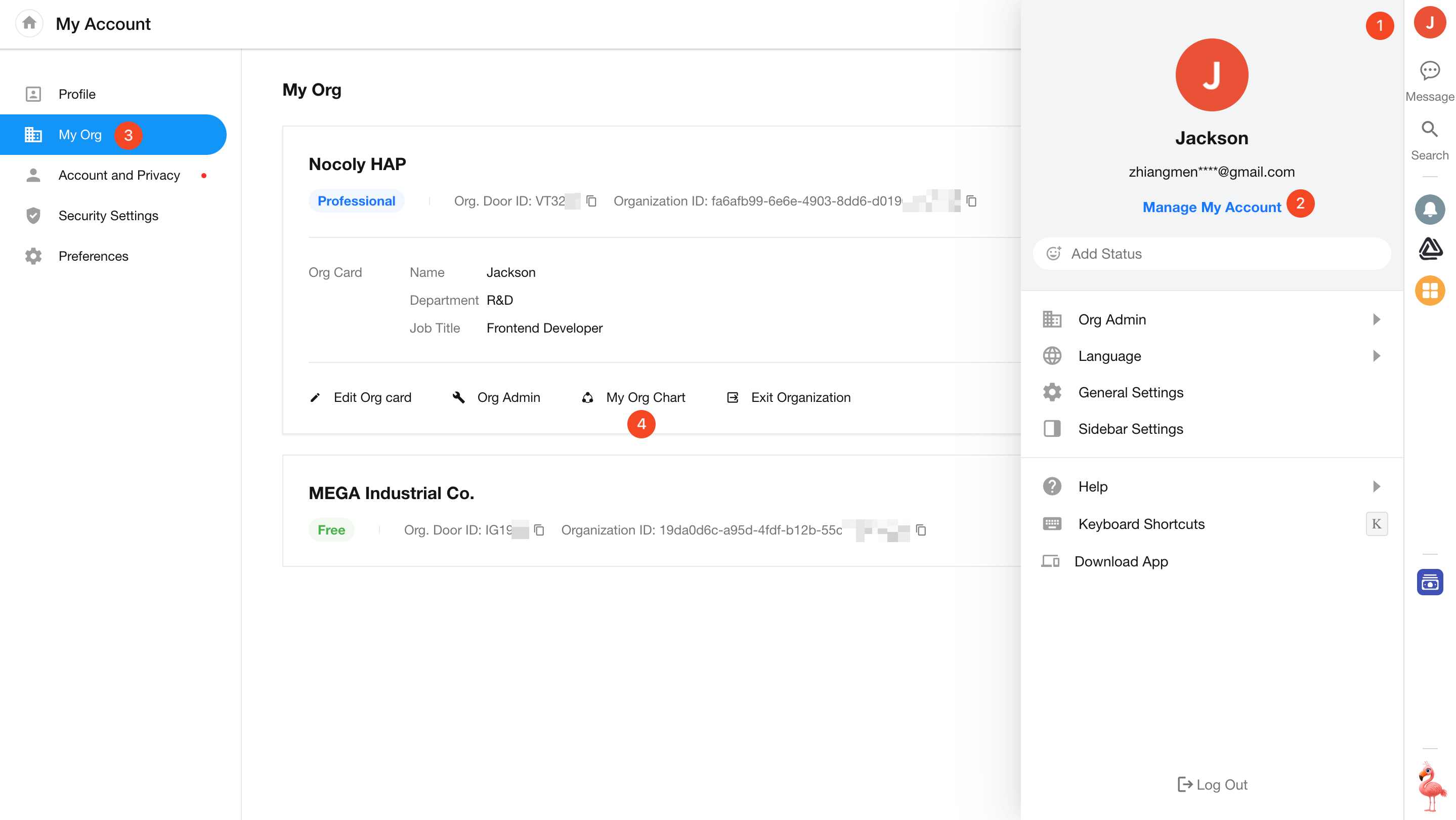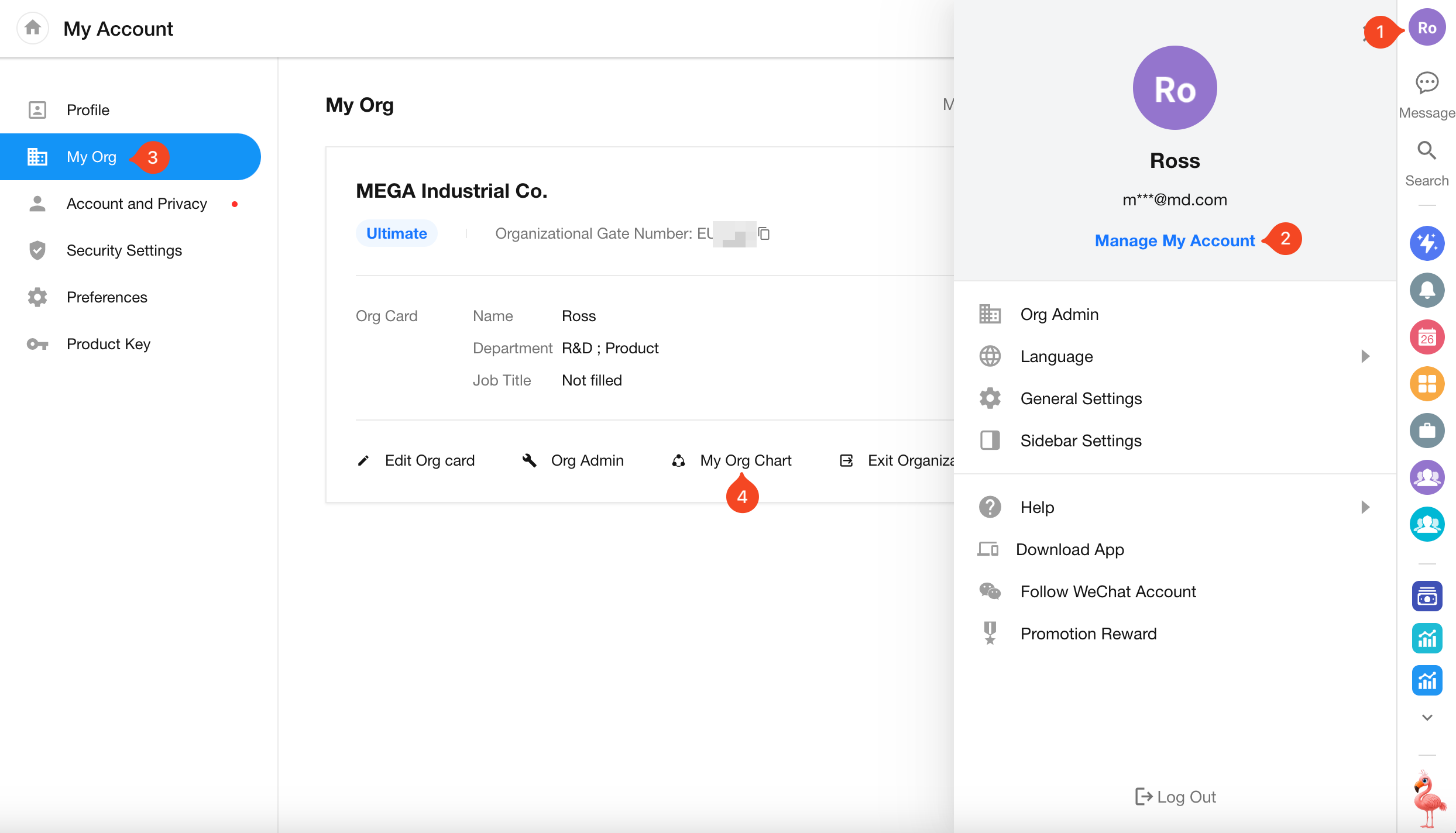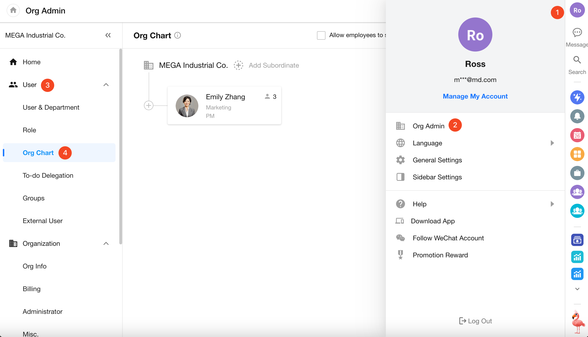 Organization admins can access the org chart by clicking their profile picture on the desktop, then navigating to [Org Admin] > [User] > [Org Chart].