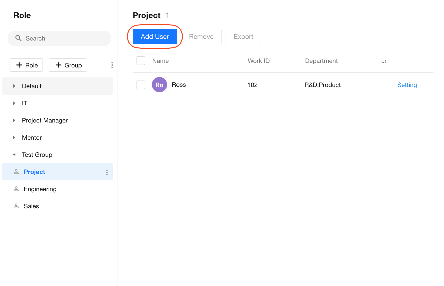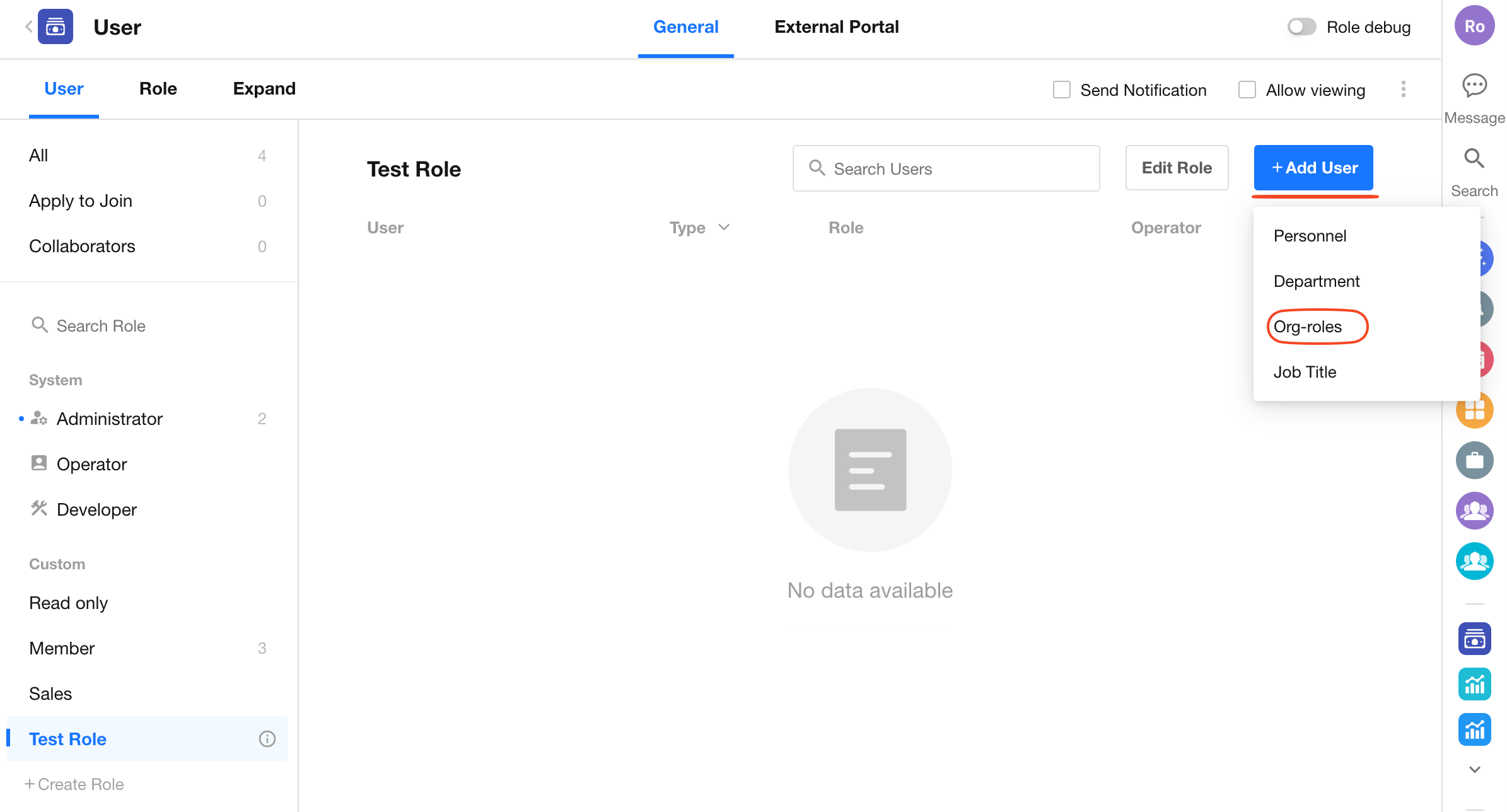 Select a role from the list. On the right, you can manage its members. Click Add User to assign users from your organization to the role. One user can belong to multiple roles.