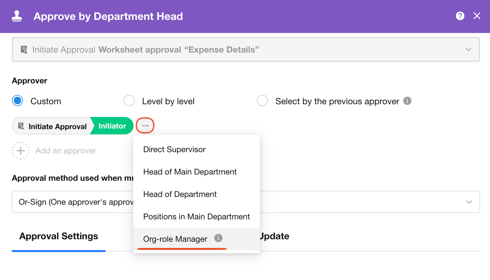 Approval node: Set approvers as members responsible for the departments in organization roles