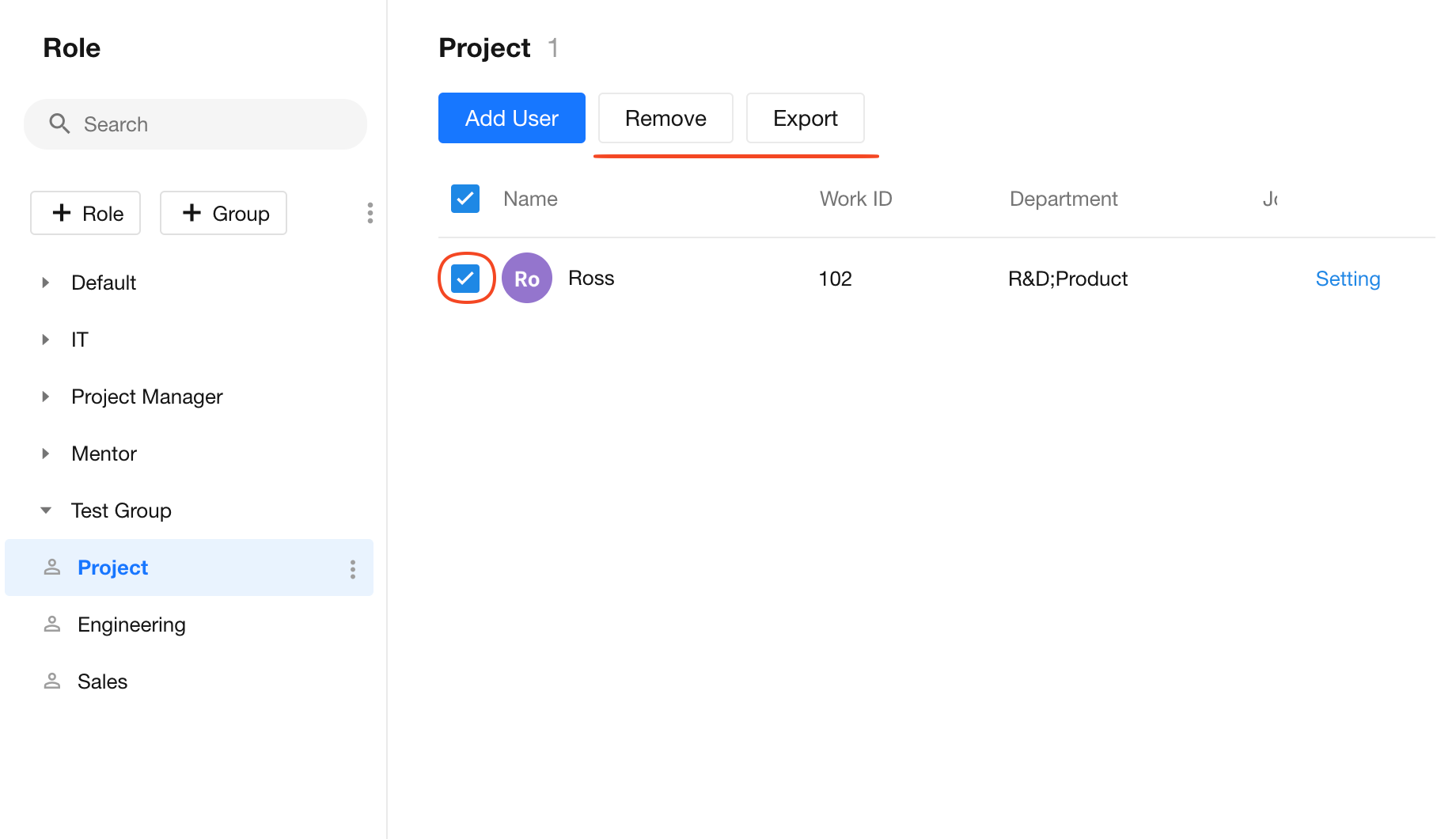Select a role and check the users from the member list on the right. You can then remove or export them.