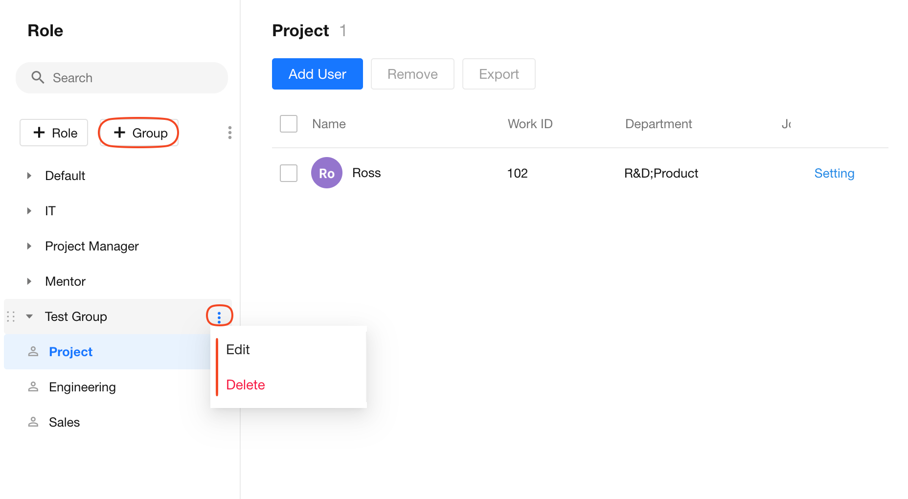 Organization roles support grouped management. There is a default system group called "Default", which cannot be edited. You can create up to 50 custom groups by clicking the "Group" button. Groups cannot be deleted if they contain roles.