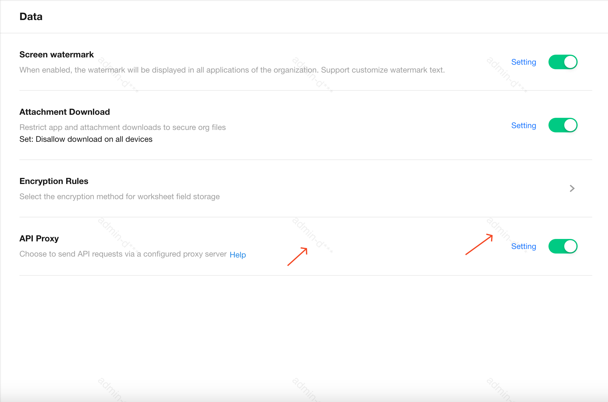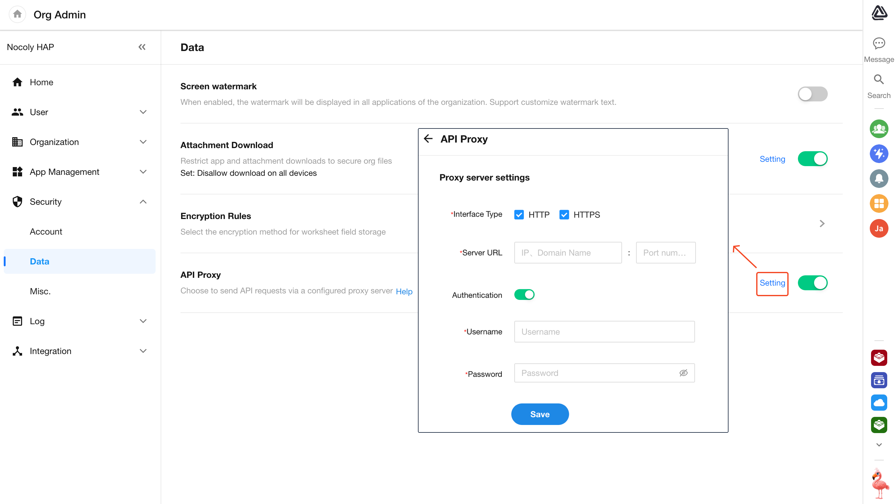 Go to [Org Admin] > [Security] > [Data], and toggle on API Proxy. Then click Setting to configure the proxy information.