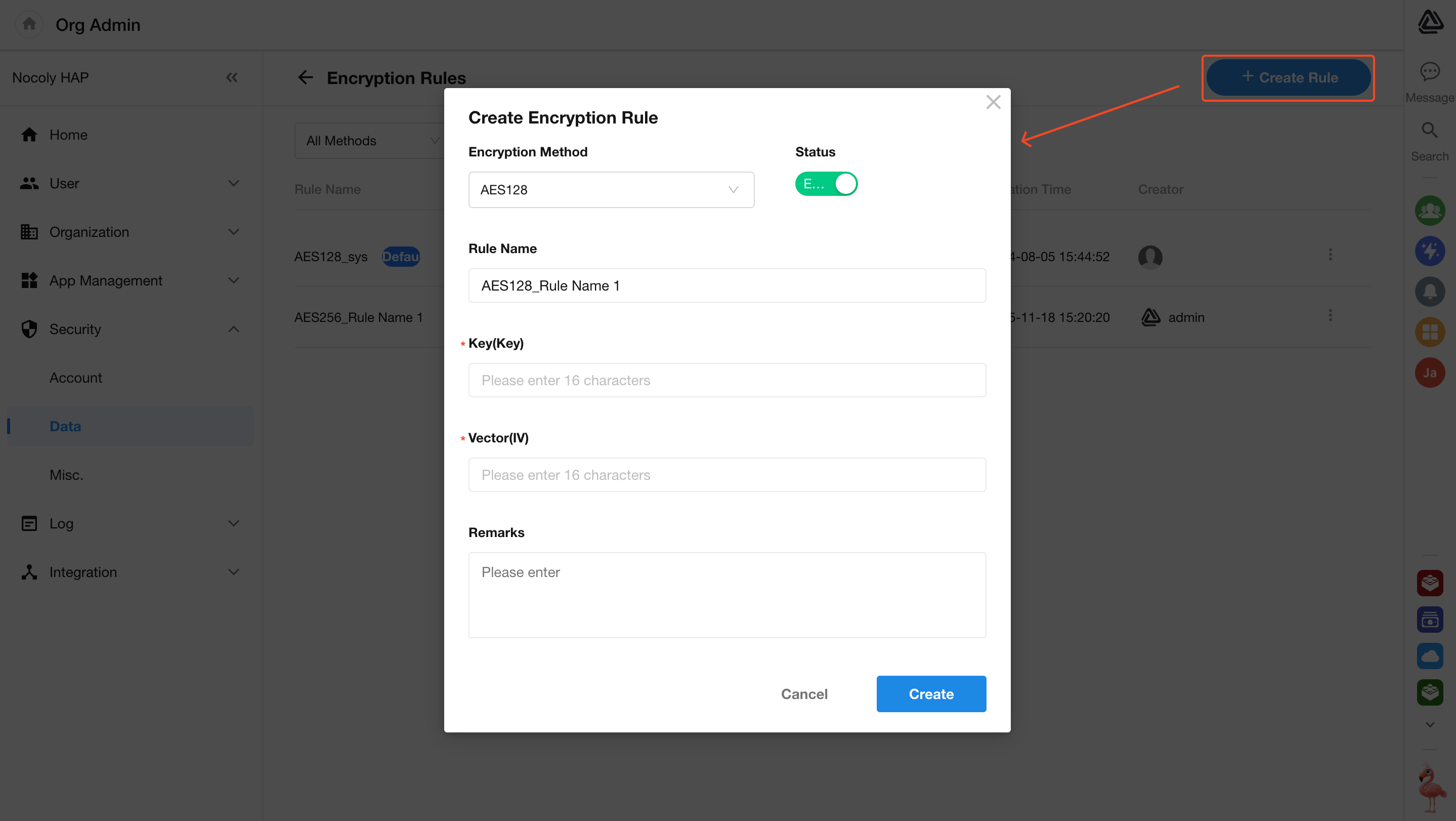 Go to [Security] > [Data] > [Encryption Rule] to create and manage encryption rules.