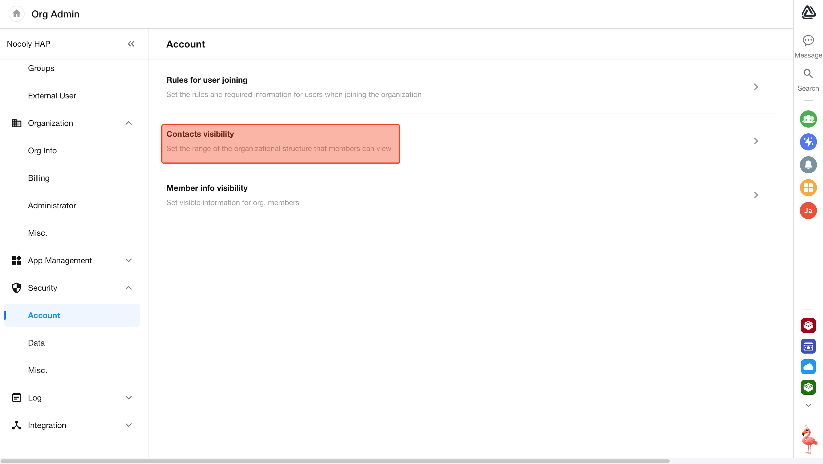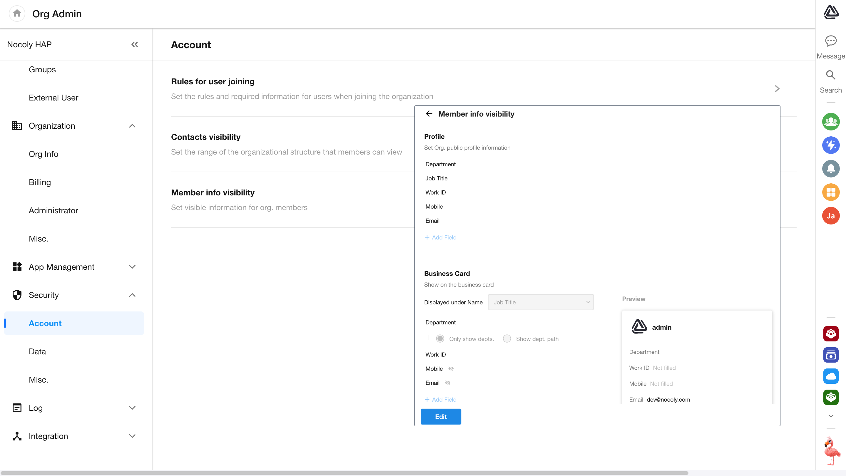 Organization administrators can configure what information is shown when members view each other's profiles and business cards under [Org Admin] > [Security] > [Account].