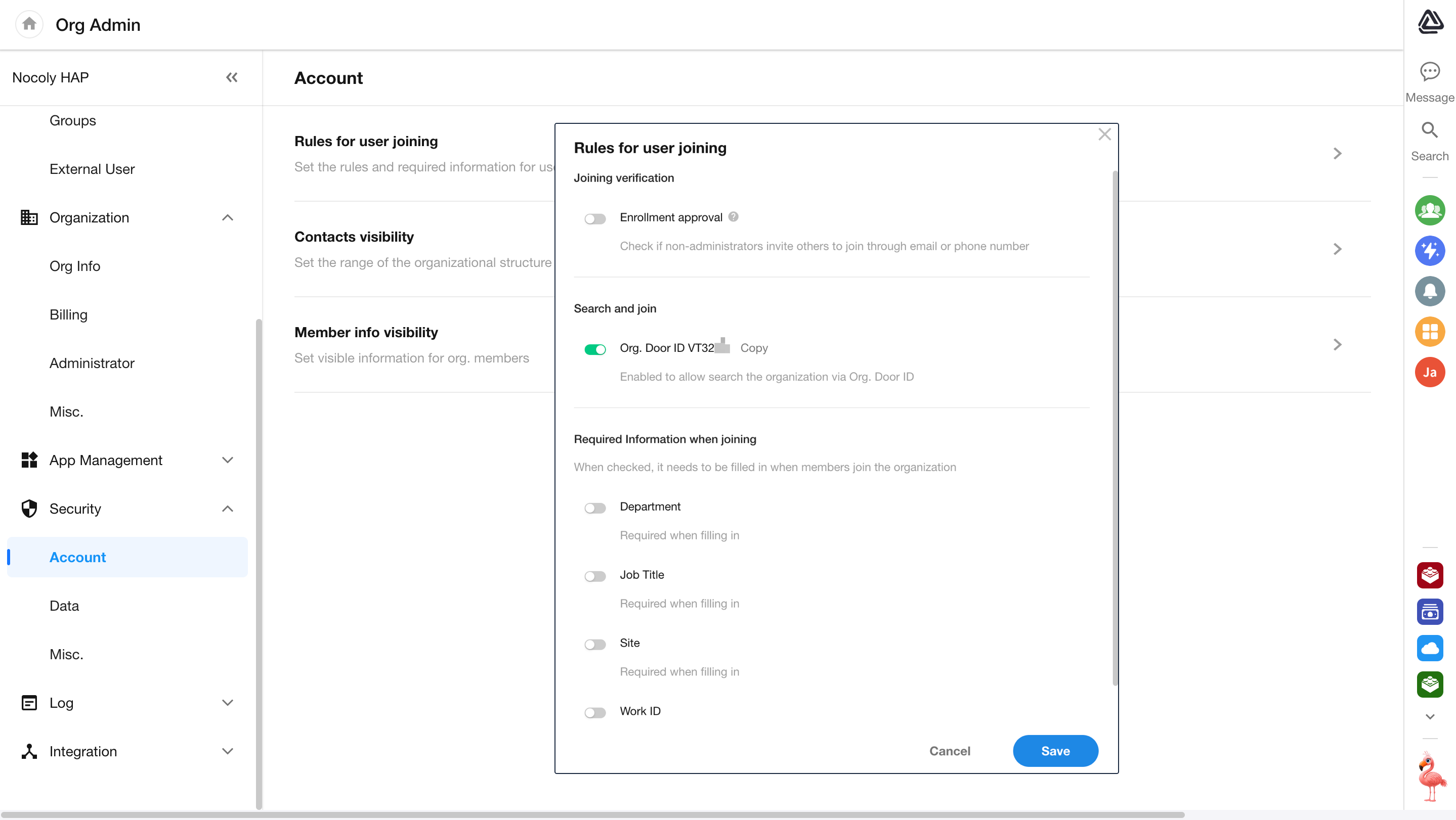 Navigate to [Org Admin] > [Security] > [Account] to define access rules when users join the organization, including approval policies and required identity information.