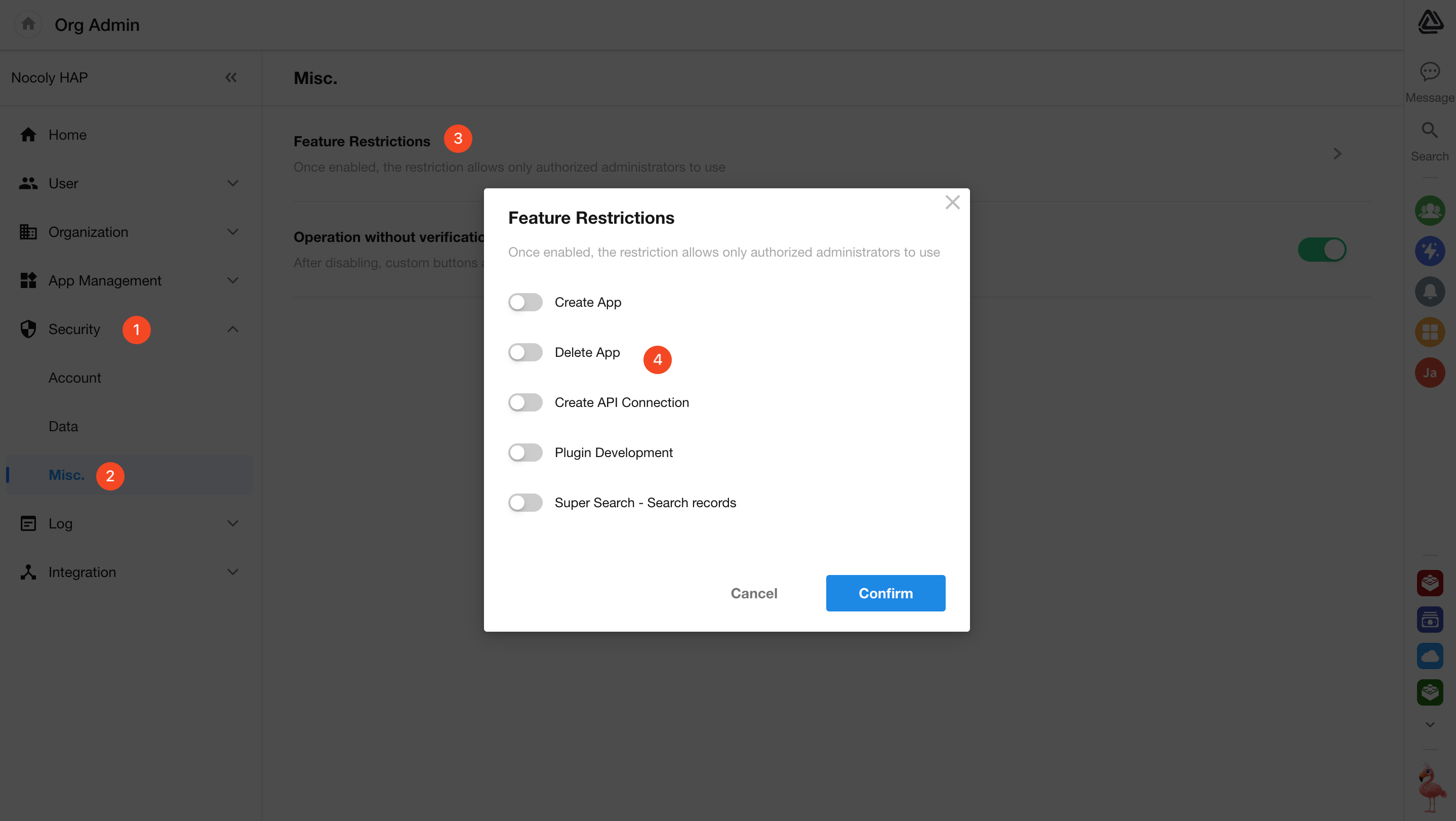 Go to [Org Admin] > [Security] > [Misc.] > [Feature Restrictions] to enable or disable each item in the popup window.