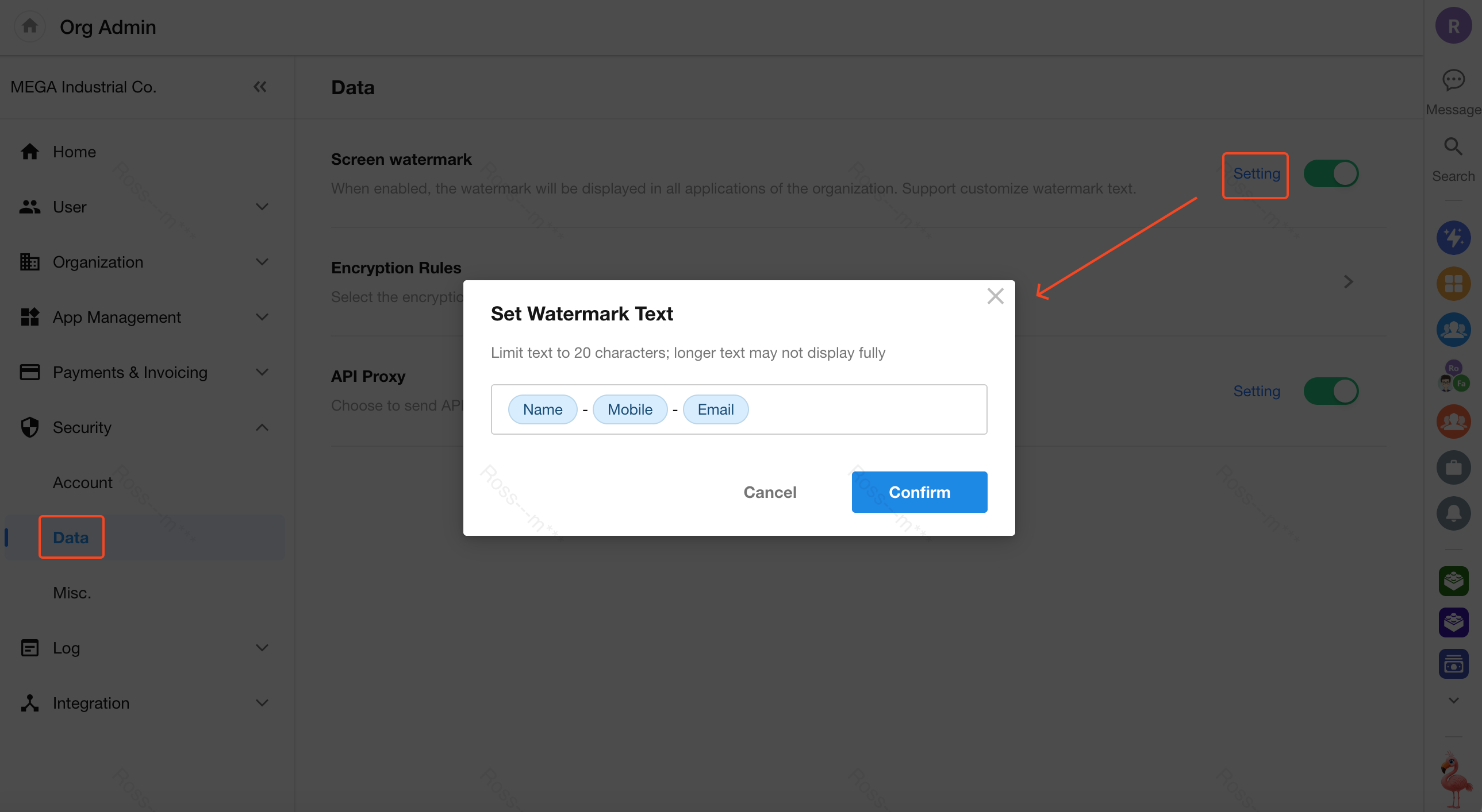 Organization admins can click the profile avatar and navigate to [Org Admin] > [Security] > [Data] to toggle the watermark setting.