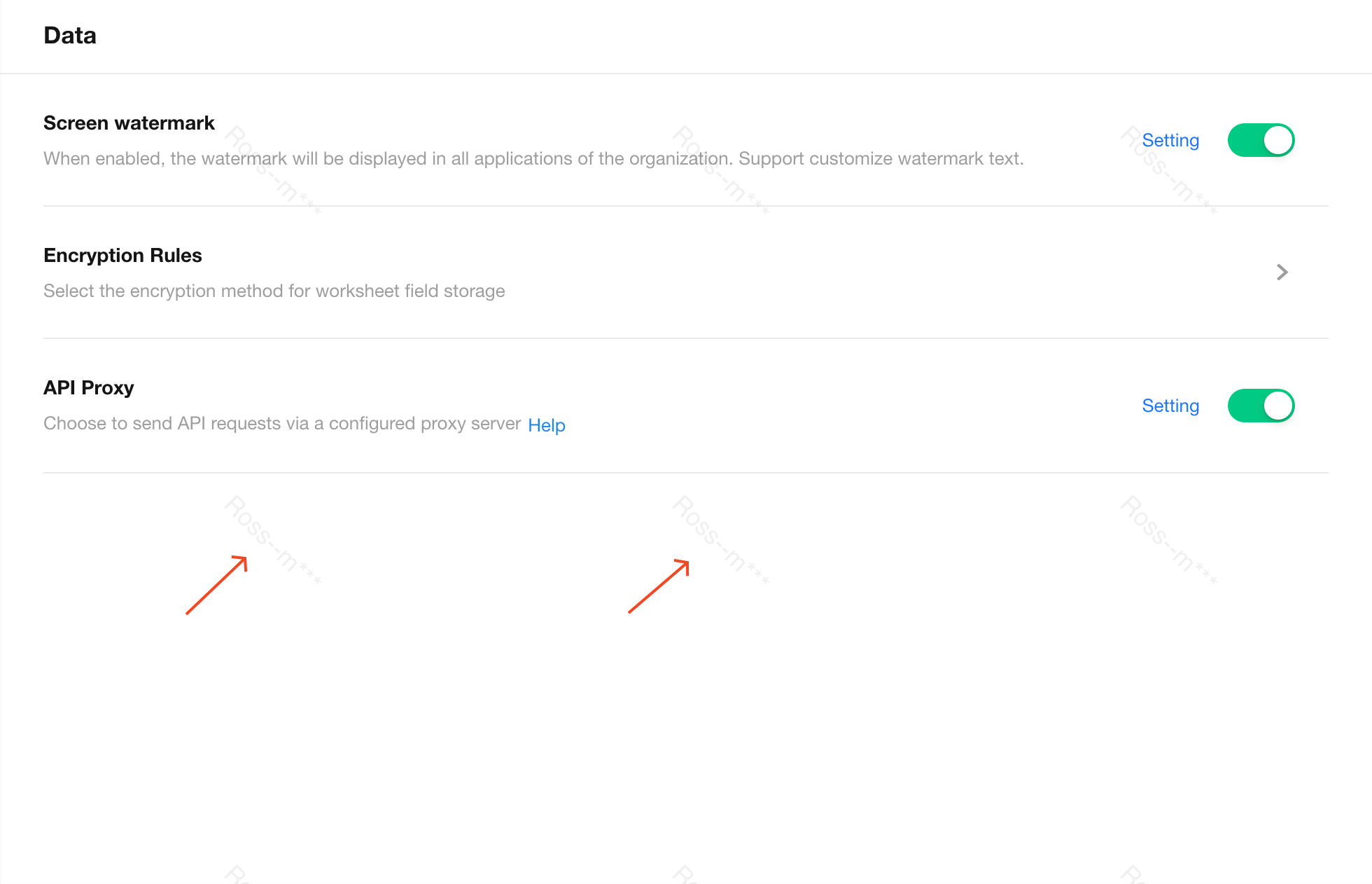 To enhance enterprise data security, screen watermarks can be enabled on the organization management console, app views, and worksheet pages.