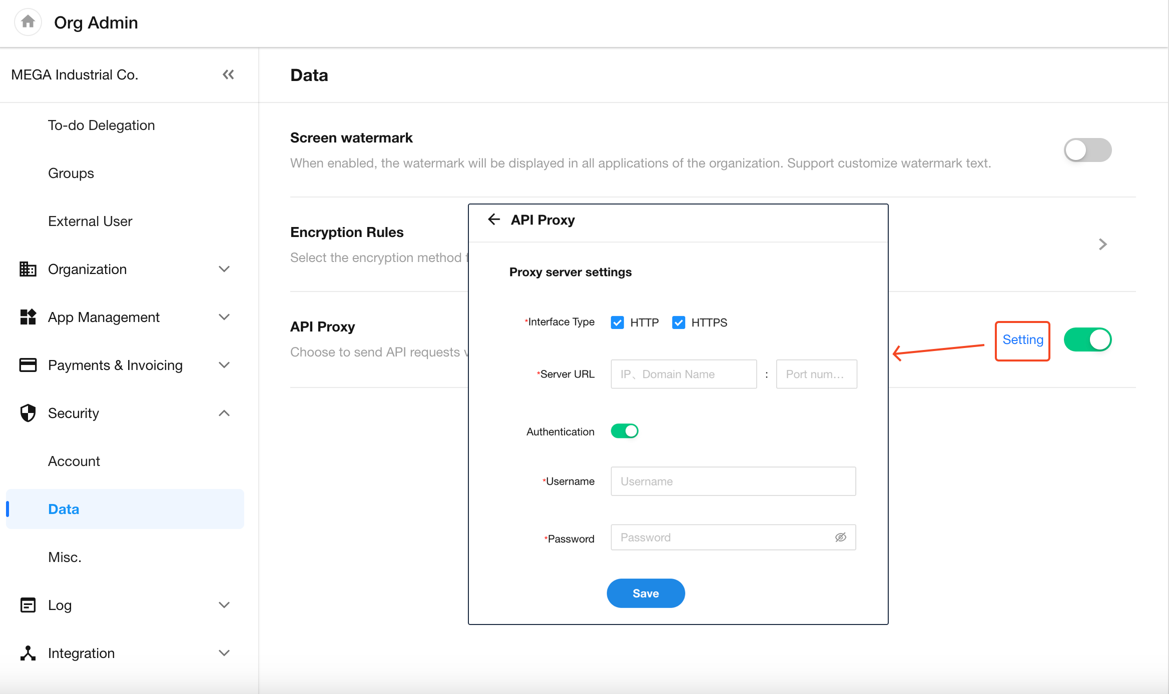 Go to [Org Admin] > [Security] > [Data], and toggle on API Proxy. Then click Setting to configure the proxy information.