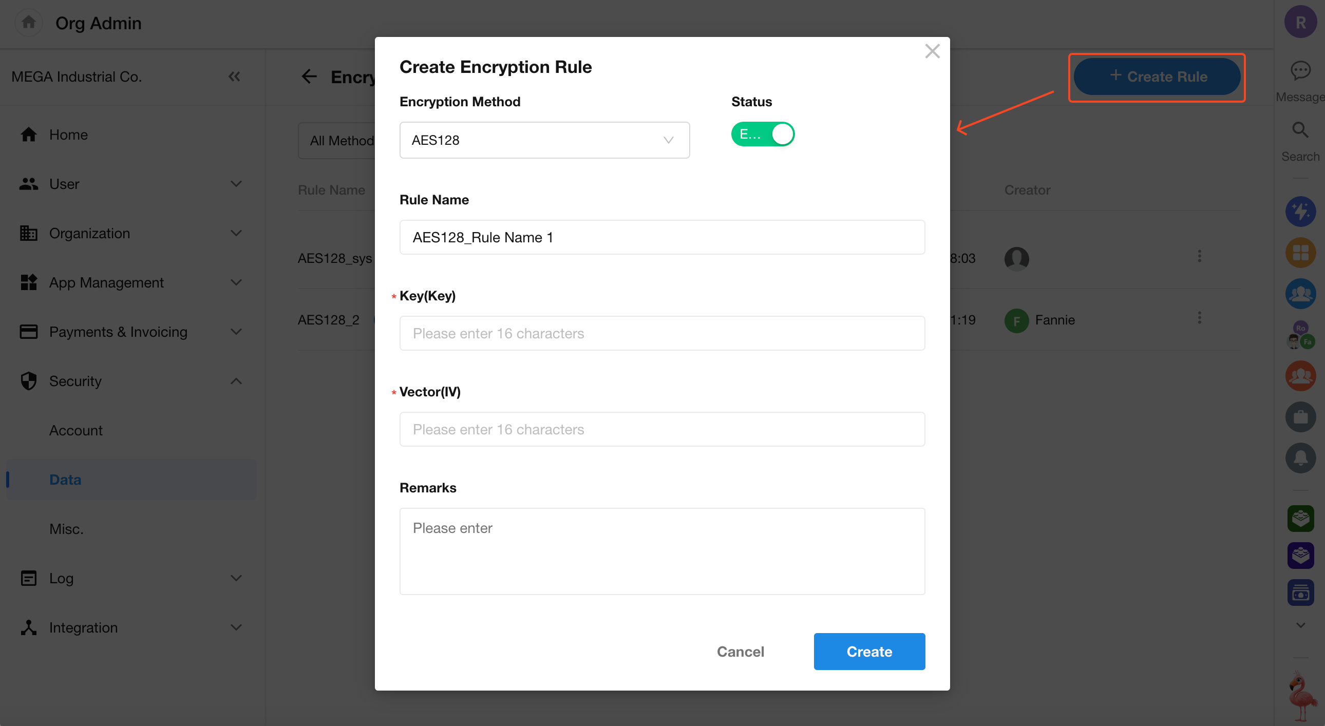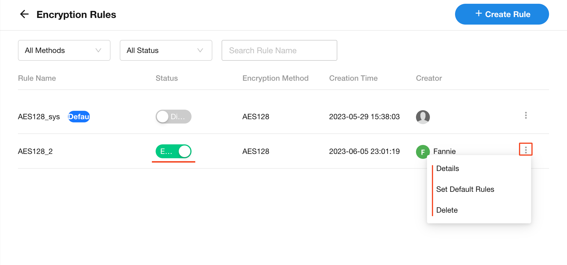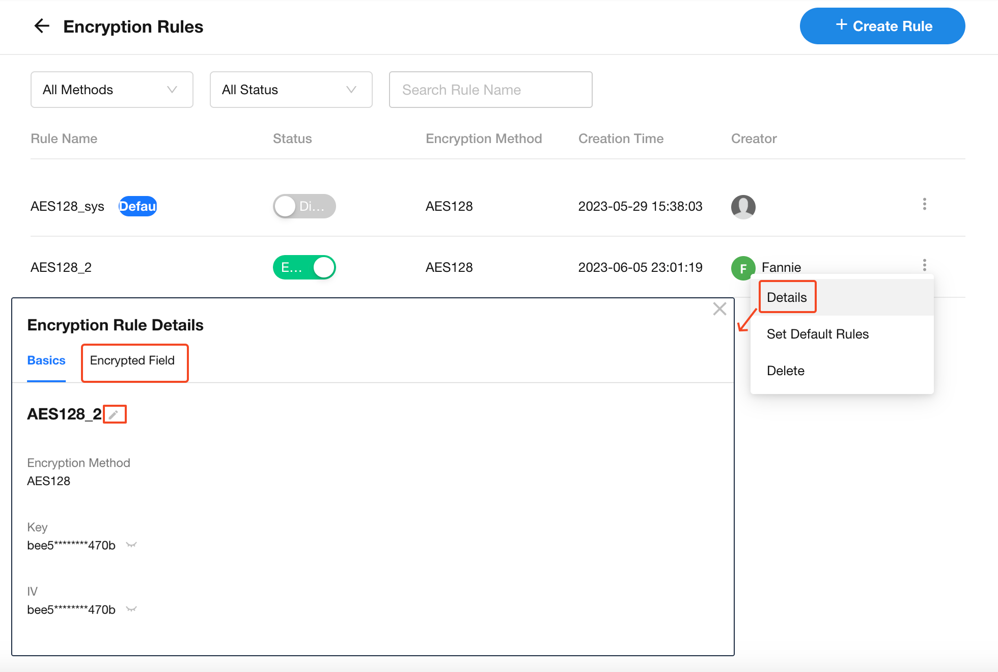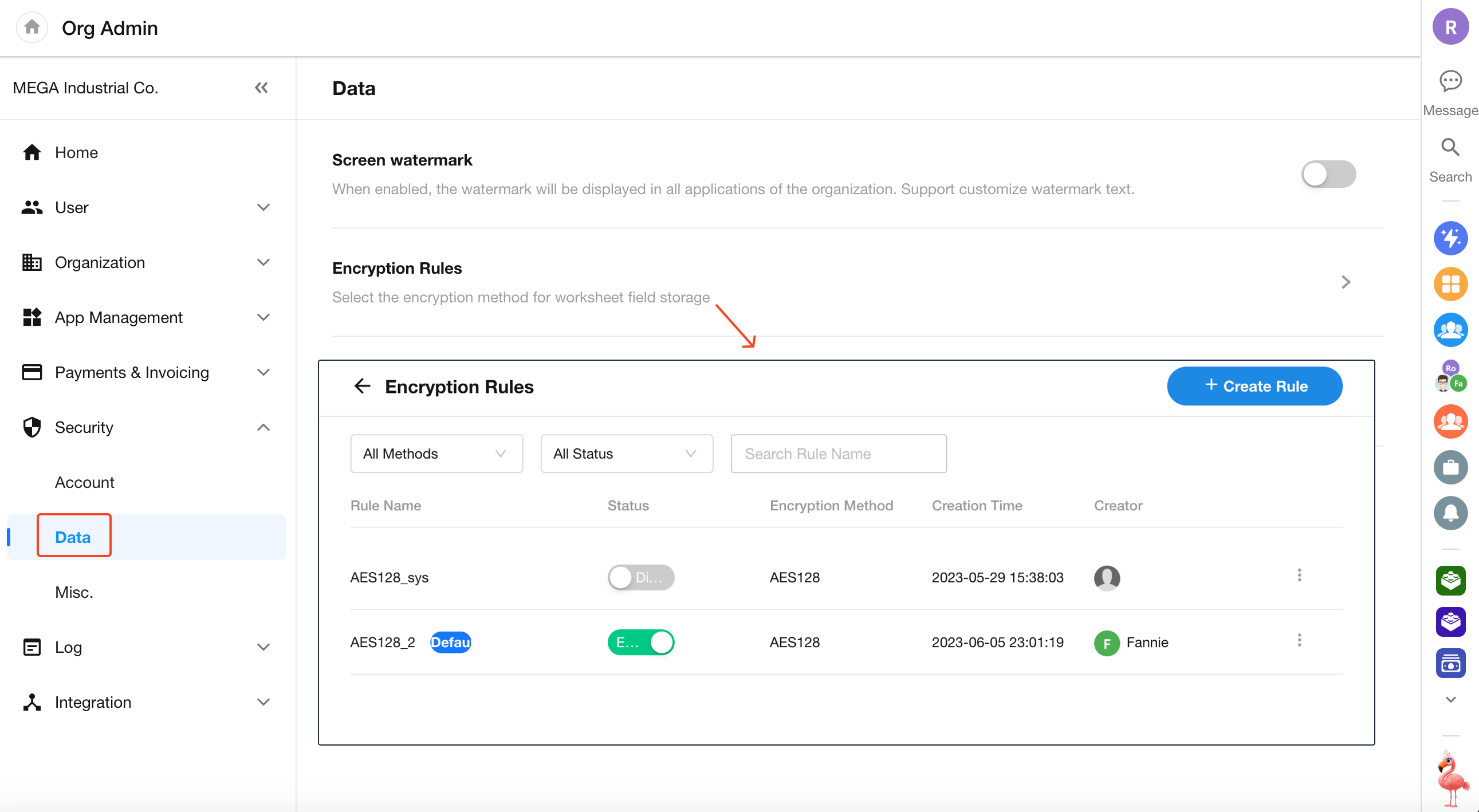Go to [Security] > [Data] > [Encryption Rule] to create and manage encryption rules.
