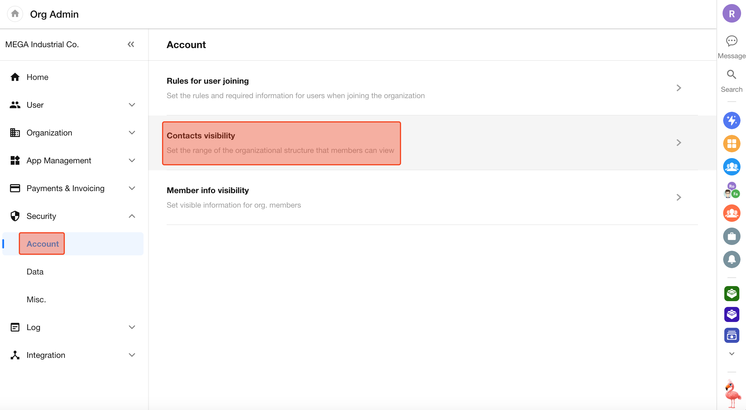 Organization administrators can configure what information is shown when members view each other's profiles and business cards under [Org Admin] > [Security] > [Account].