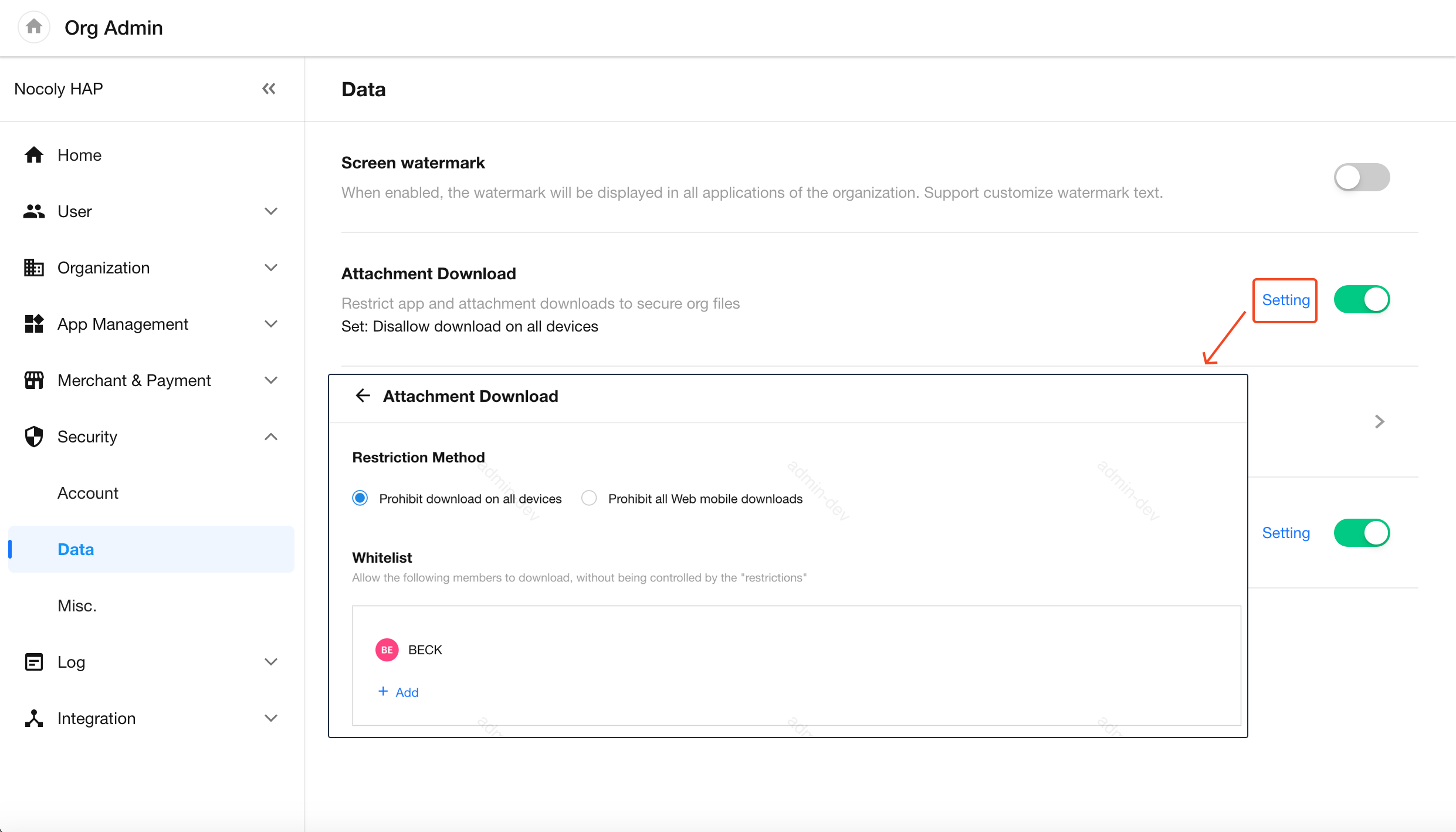 [Organization Admin] > [Security] > [Data], then enable or disable Attachment Download Restriction.