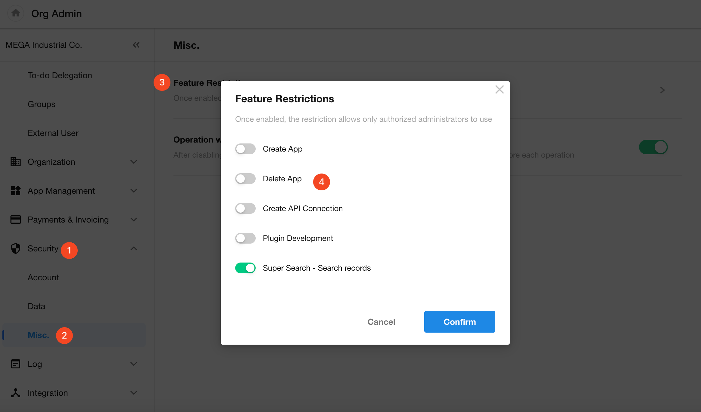 Go to [Org Admin] > [Security] > [Misc.] > [Feature Restrictions] to enable or disable each item in the popup window.
