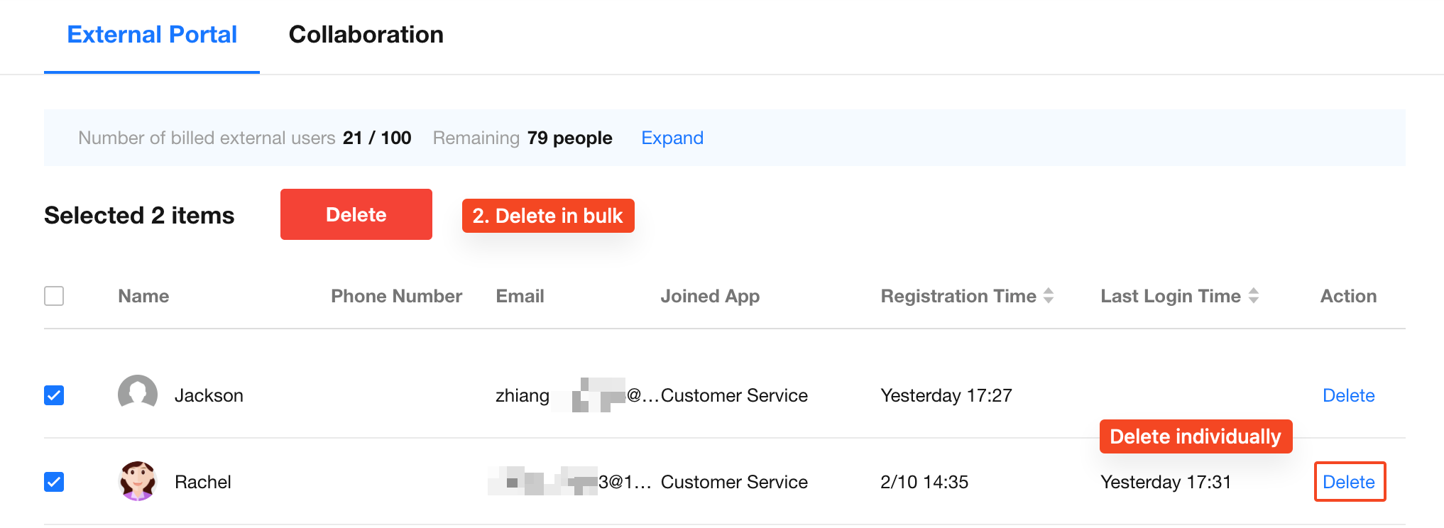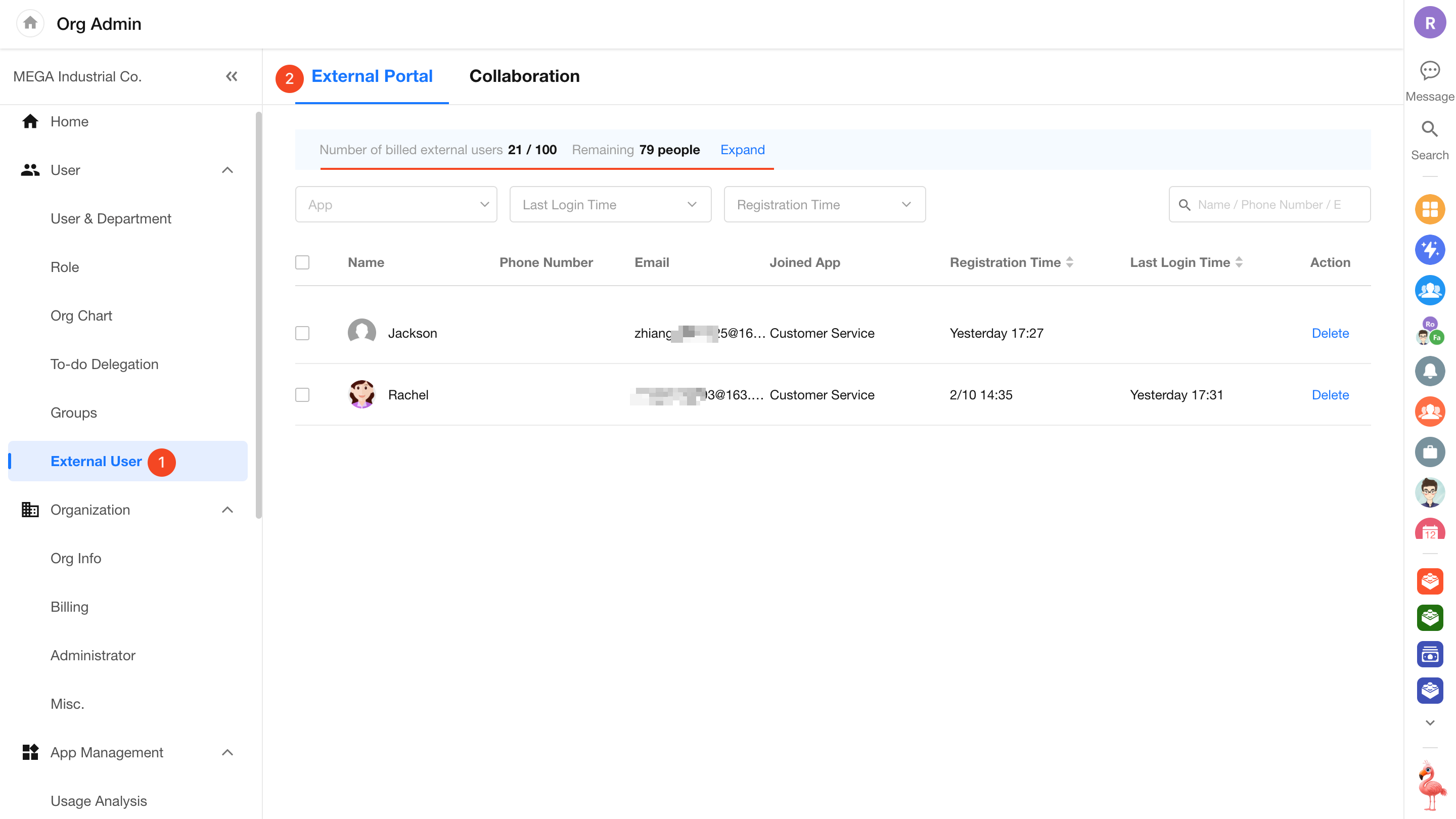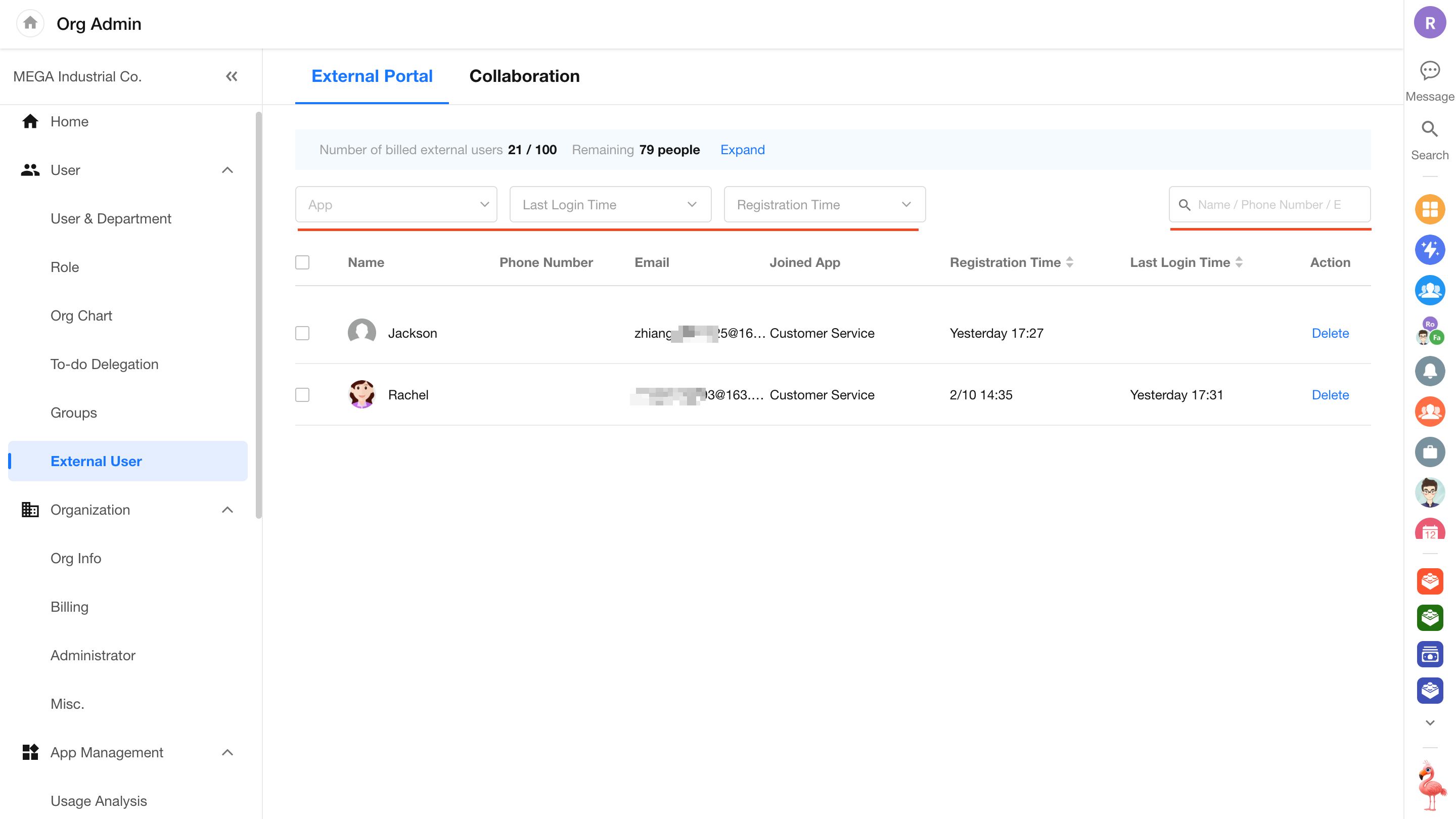 Each application within an organization can enable an external portal to allow registration from external users. In the Organization Admin Console, administrators can centrally manage all external users across different applications. Key capabilities include: