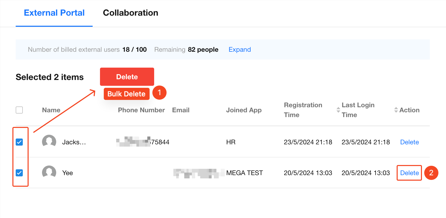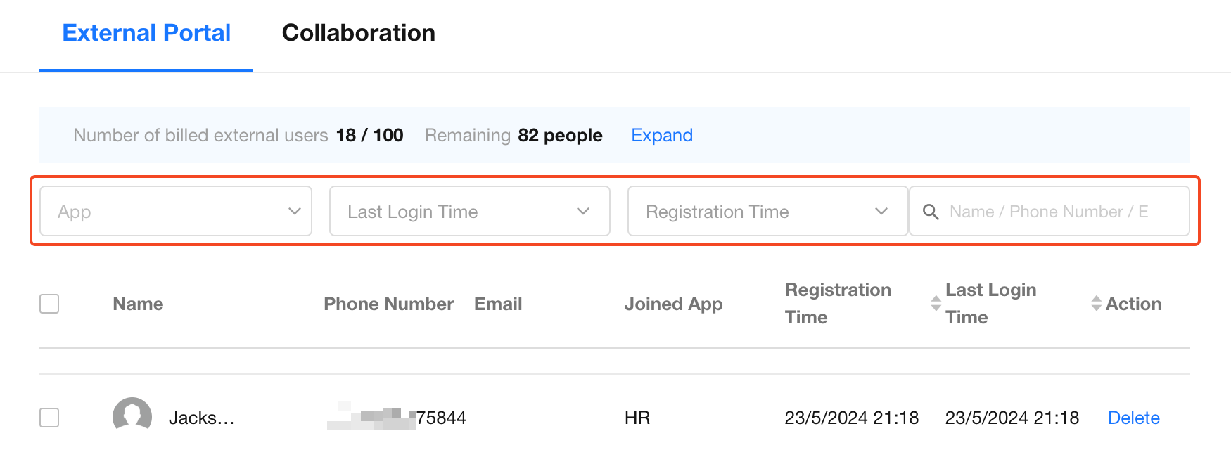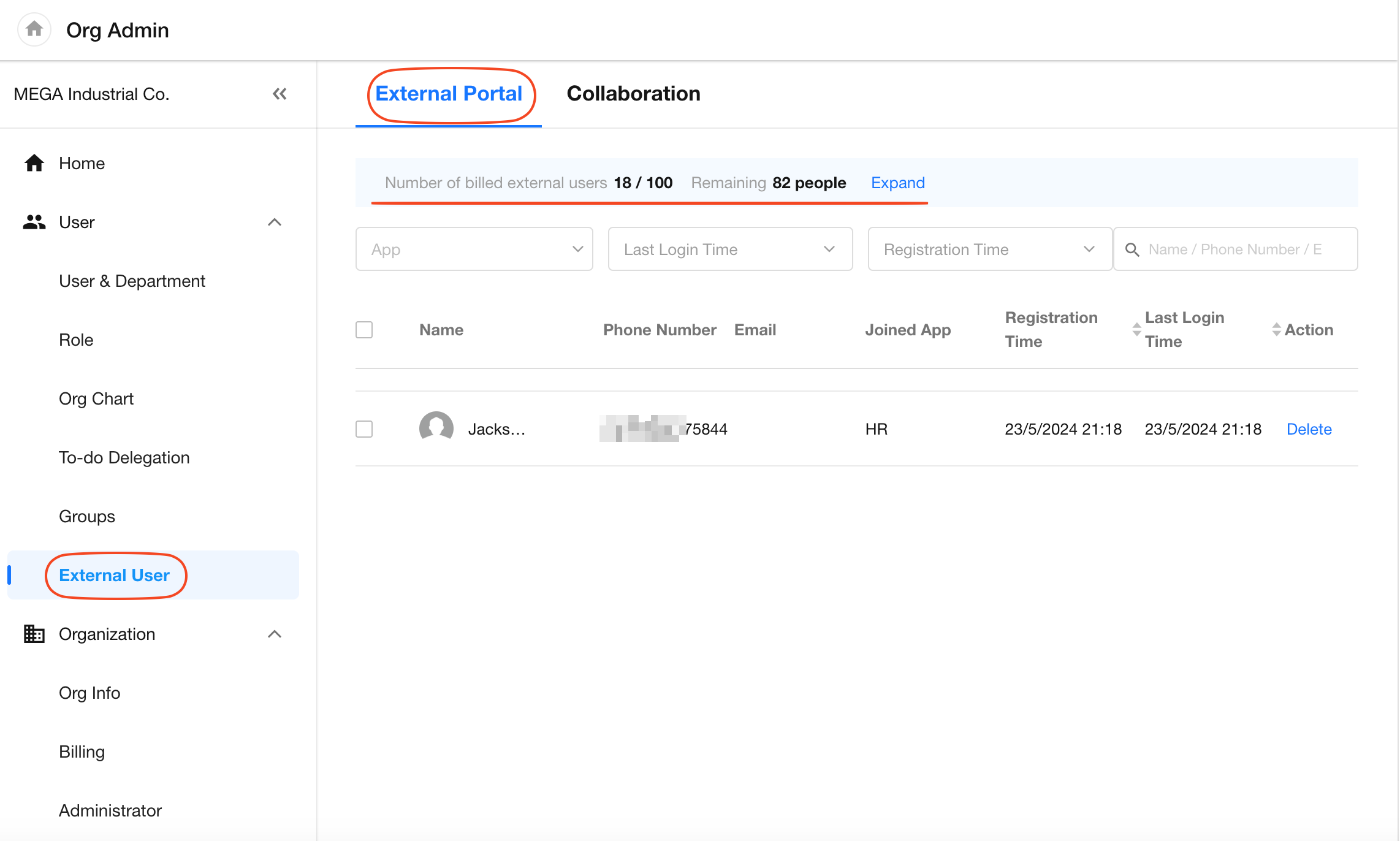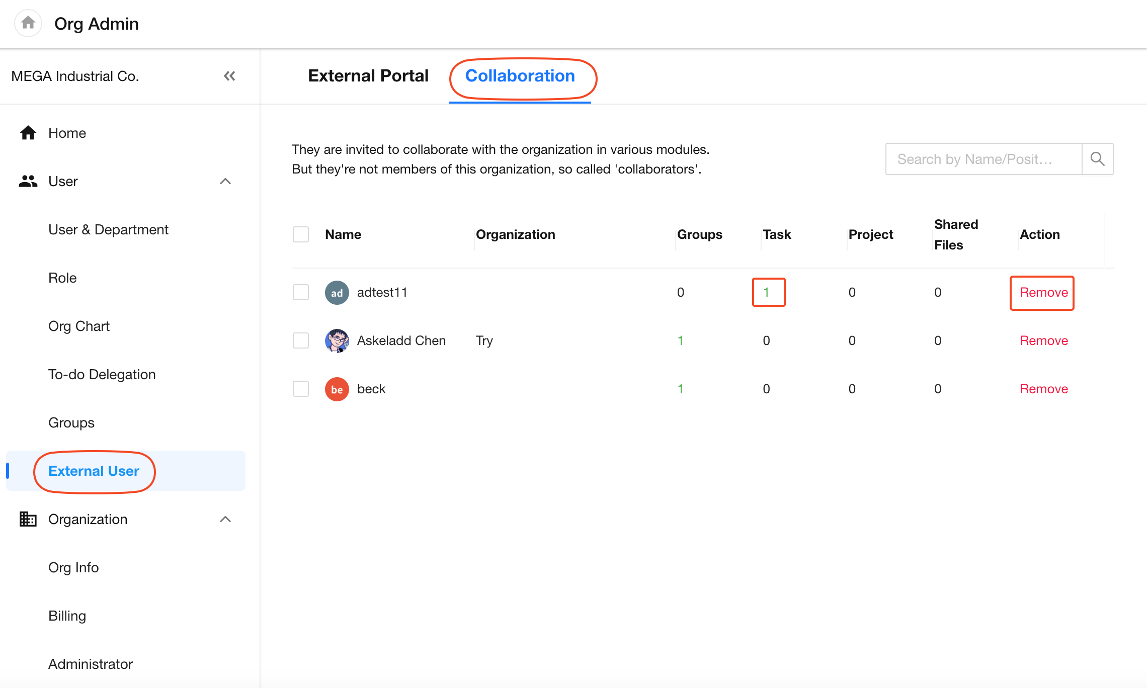In the [Org Admin] > [External User] section, switch to the Collaboration tab to manage all external collaborators.