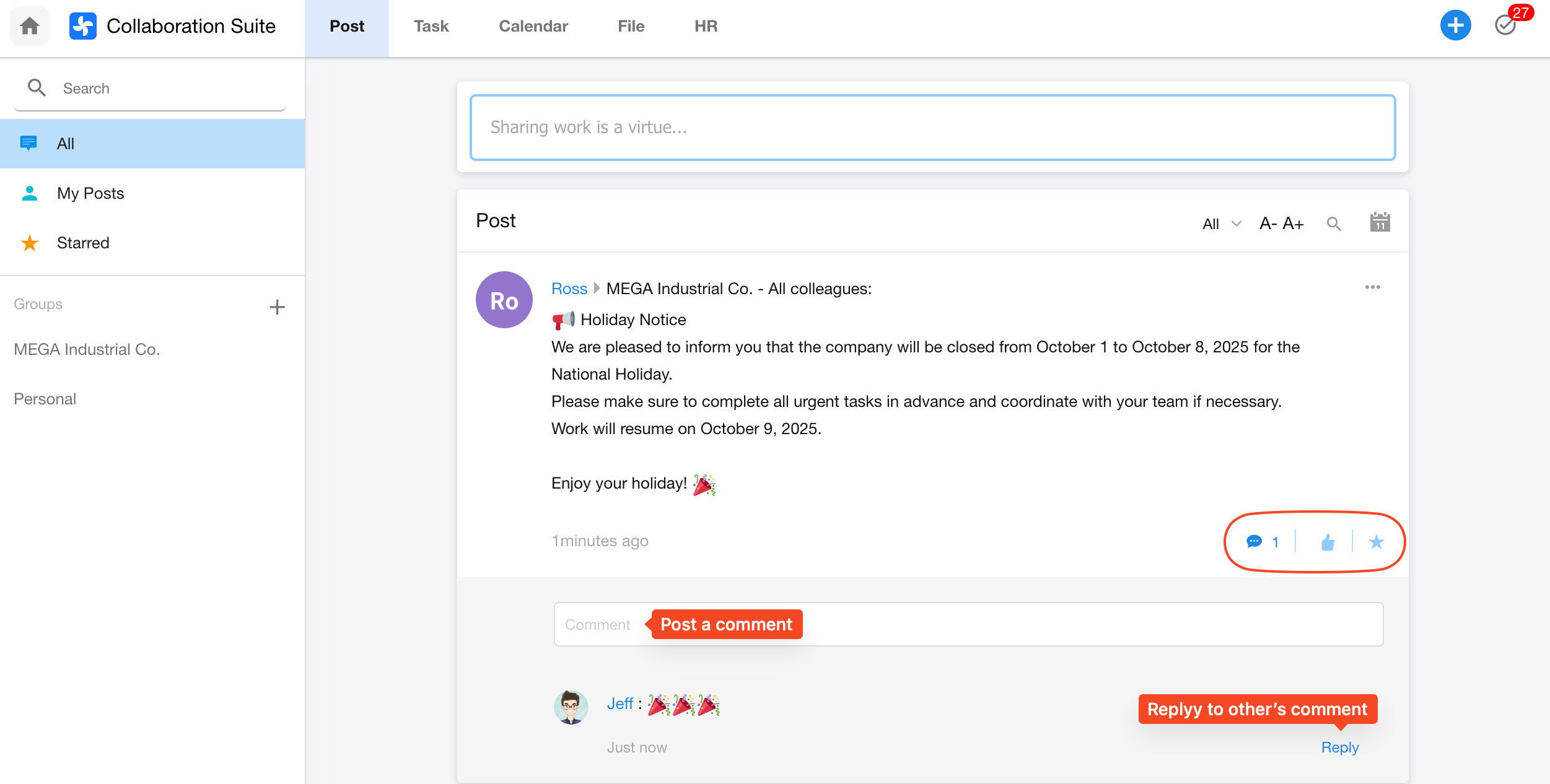 - Favorited posts can be accessed in the Starred tab in the left navigation.