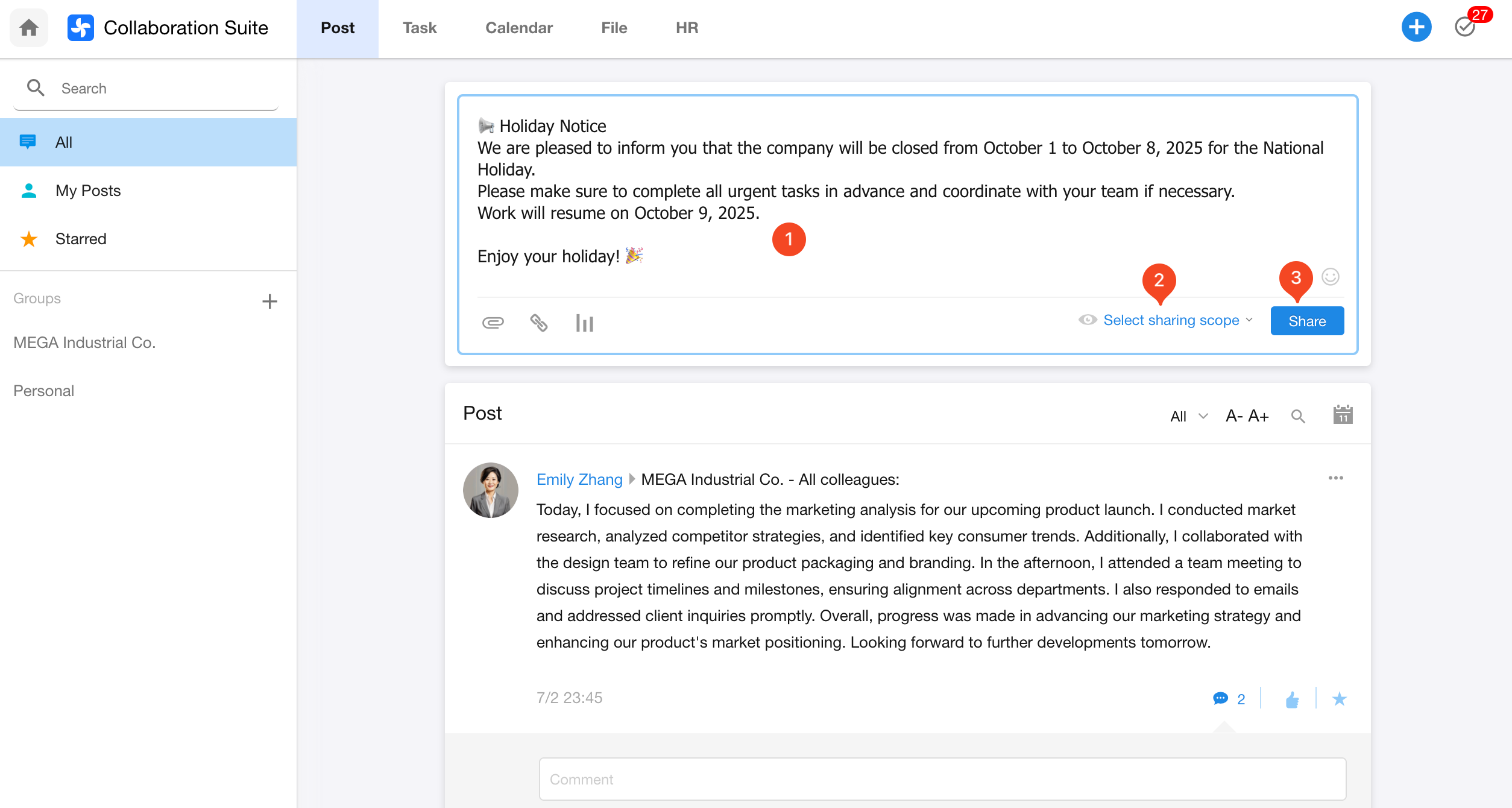 If you choose All Colleagues, then everyone in the organization can view the post.