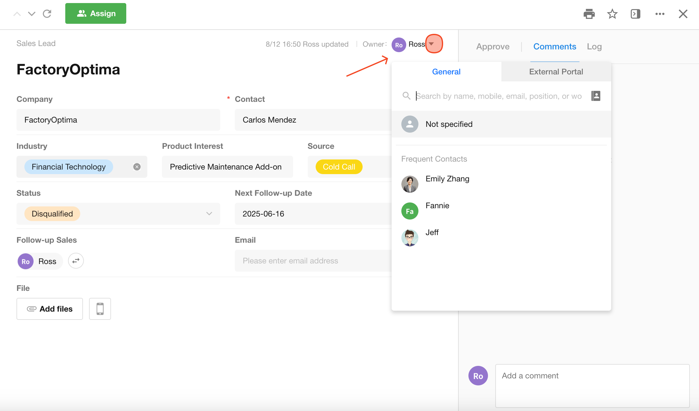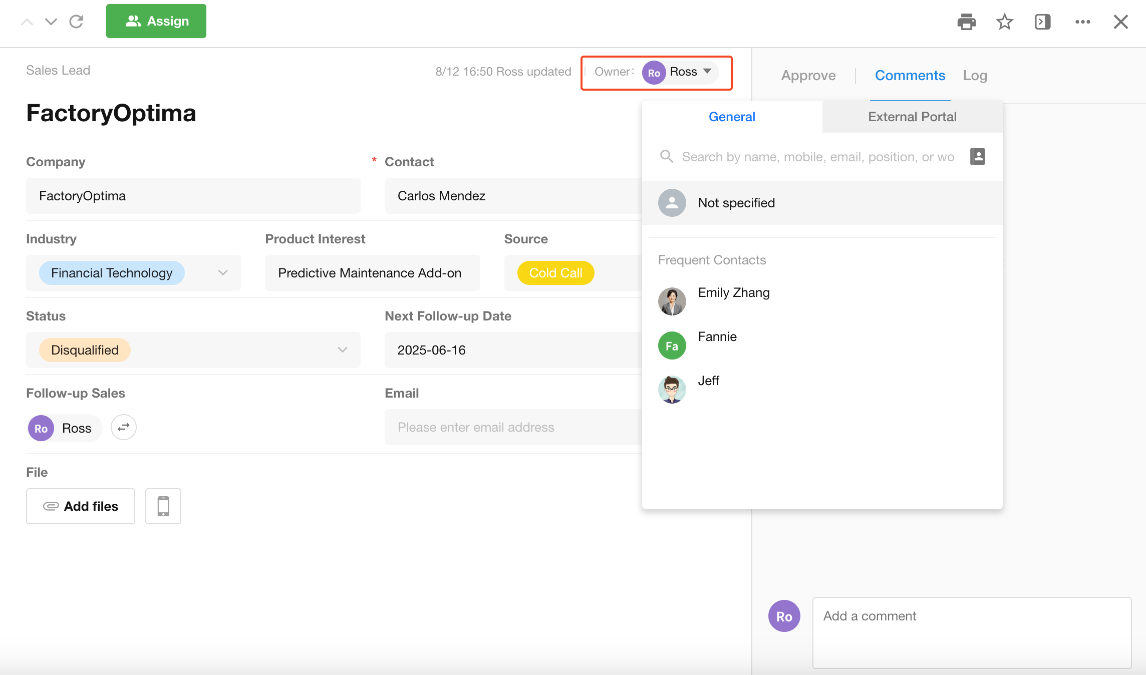 Every record includes a system field called Owner, which defines the actual record owner or manager. The owner has full permissions to view, edit, and delete the record. By default, the creator becomes the owner, but you can assign ownership to another user.