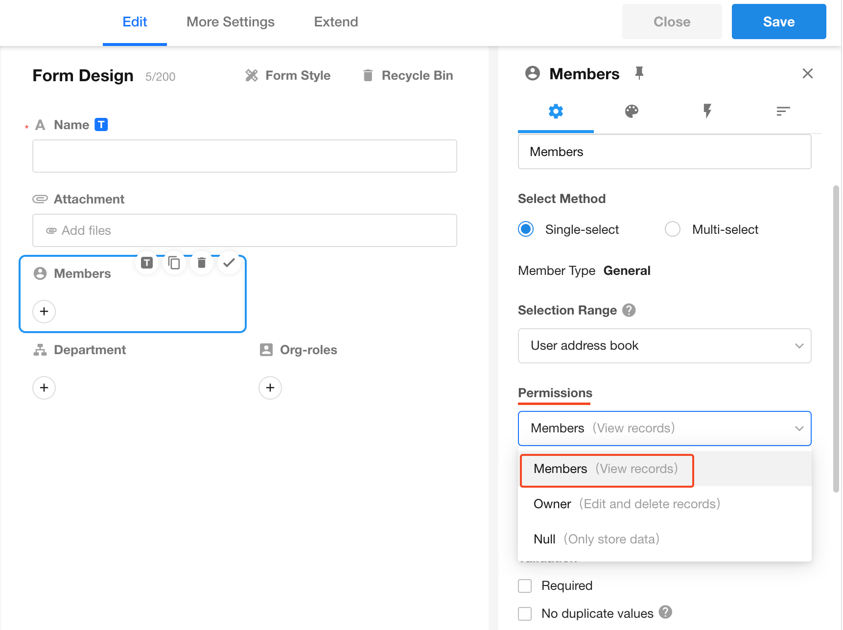 In addition to the system-defined Owner field, you can grant owner-level permissions to users selected in Members field, Department field, or Org-roles field.