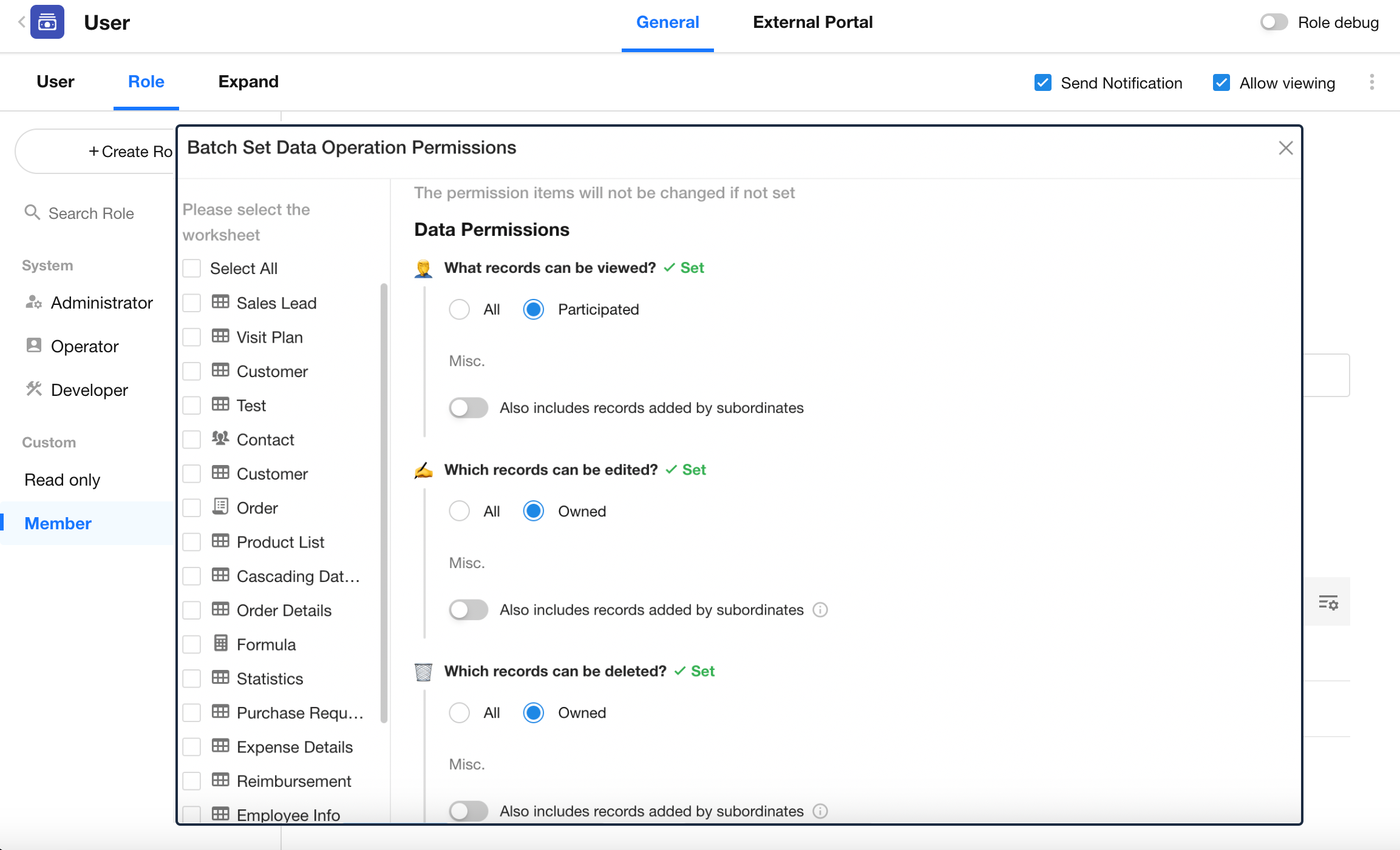 Each record in a worksheet represents a complete business object. For collaboration between multiple users, different permission levels—such as view, edit, and delete—must be assigned accordingly.