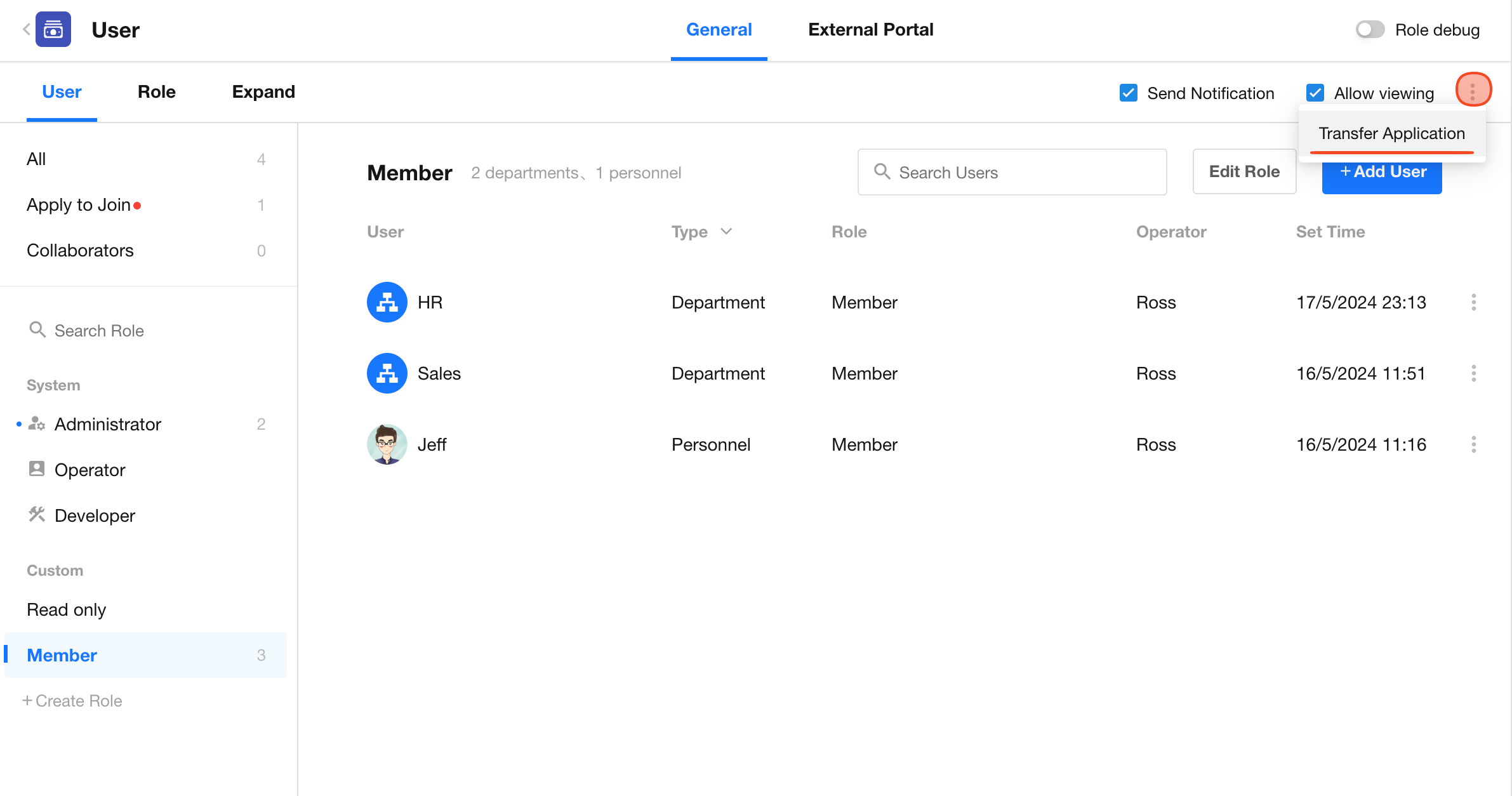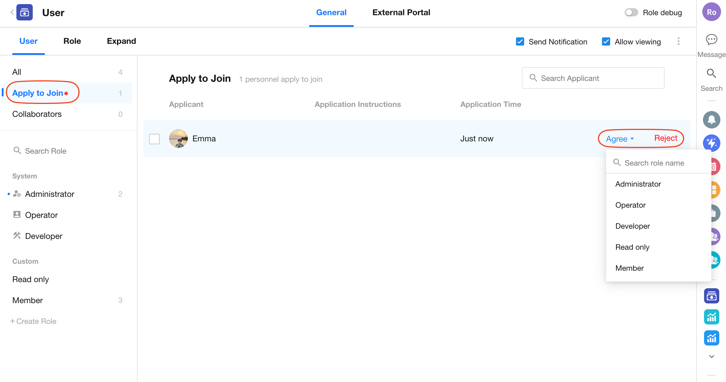 Apply to Join: Shows users who have applied to join a role but have not yet been approved. Admins can approve or reject these requests and assign roles.