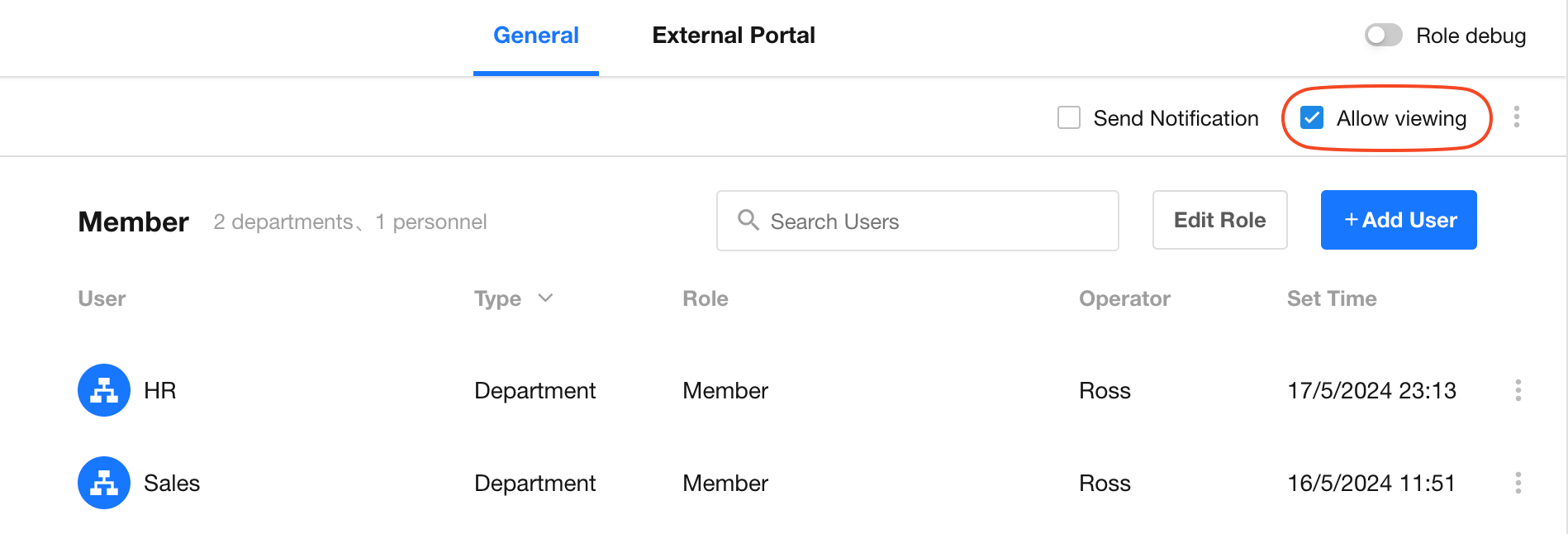 If "Allow viewing" is enabled, all users can see the list of roles and users.
