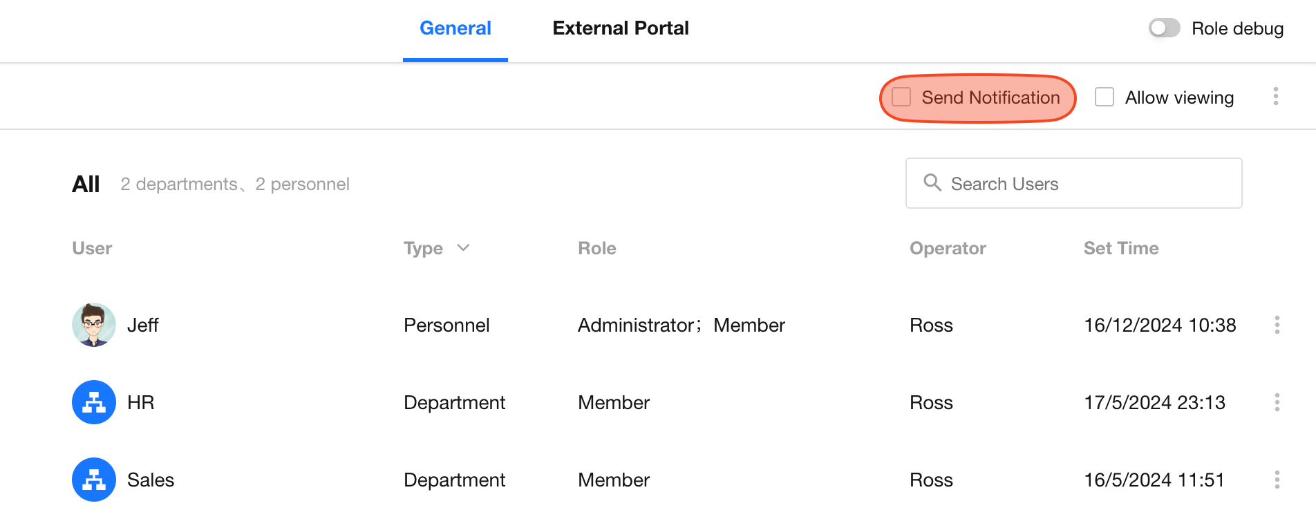 All: Displays users across all roles, including their positions, departments, and organization roles.