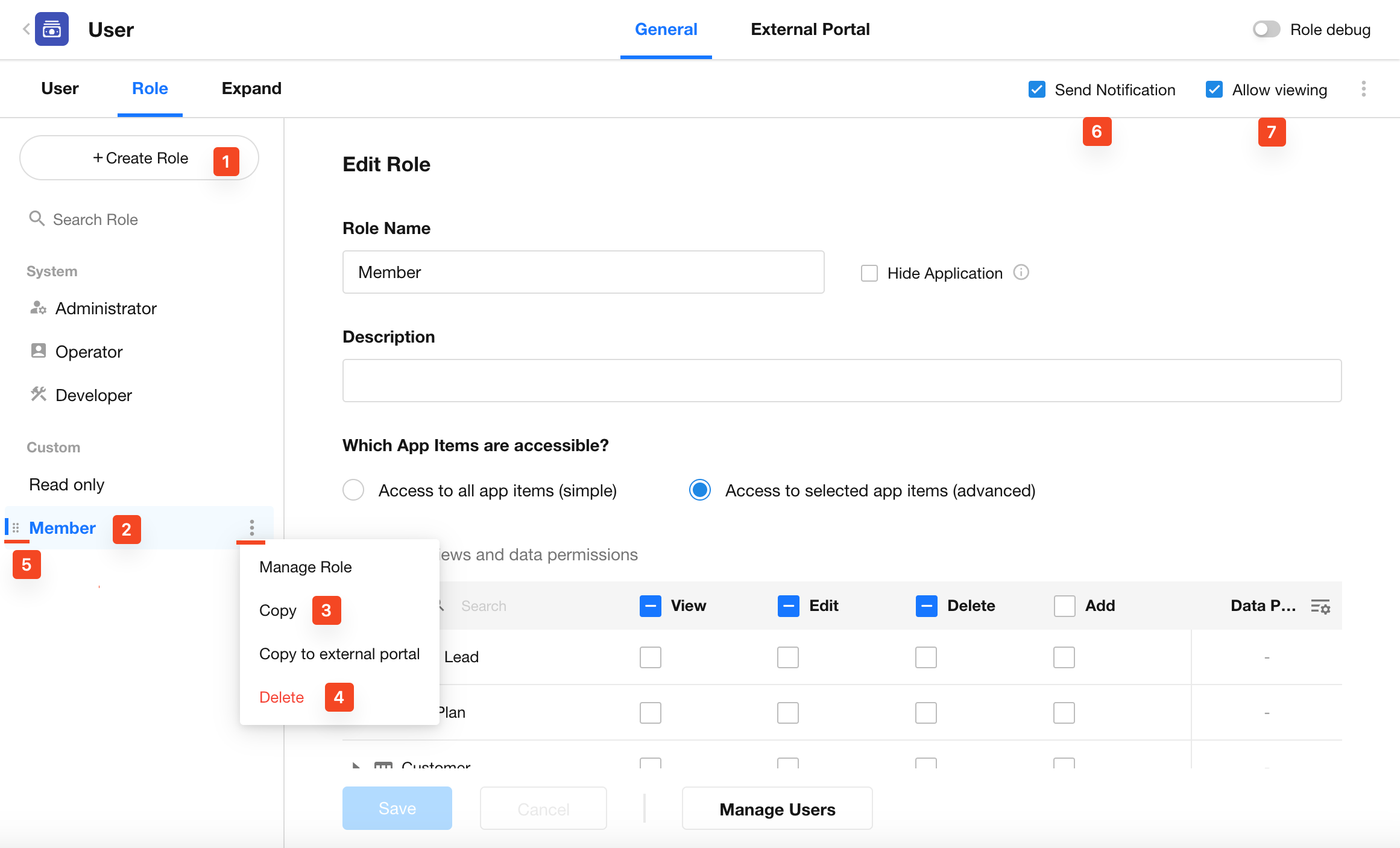 3. Copy Role: Click the (⋮) on the right to duplicate the role. Only the role's permission settings and description will be copied—users will not be included.