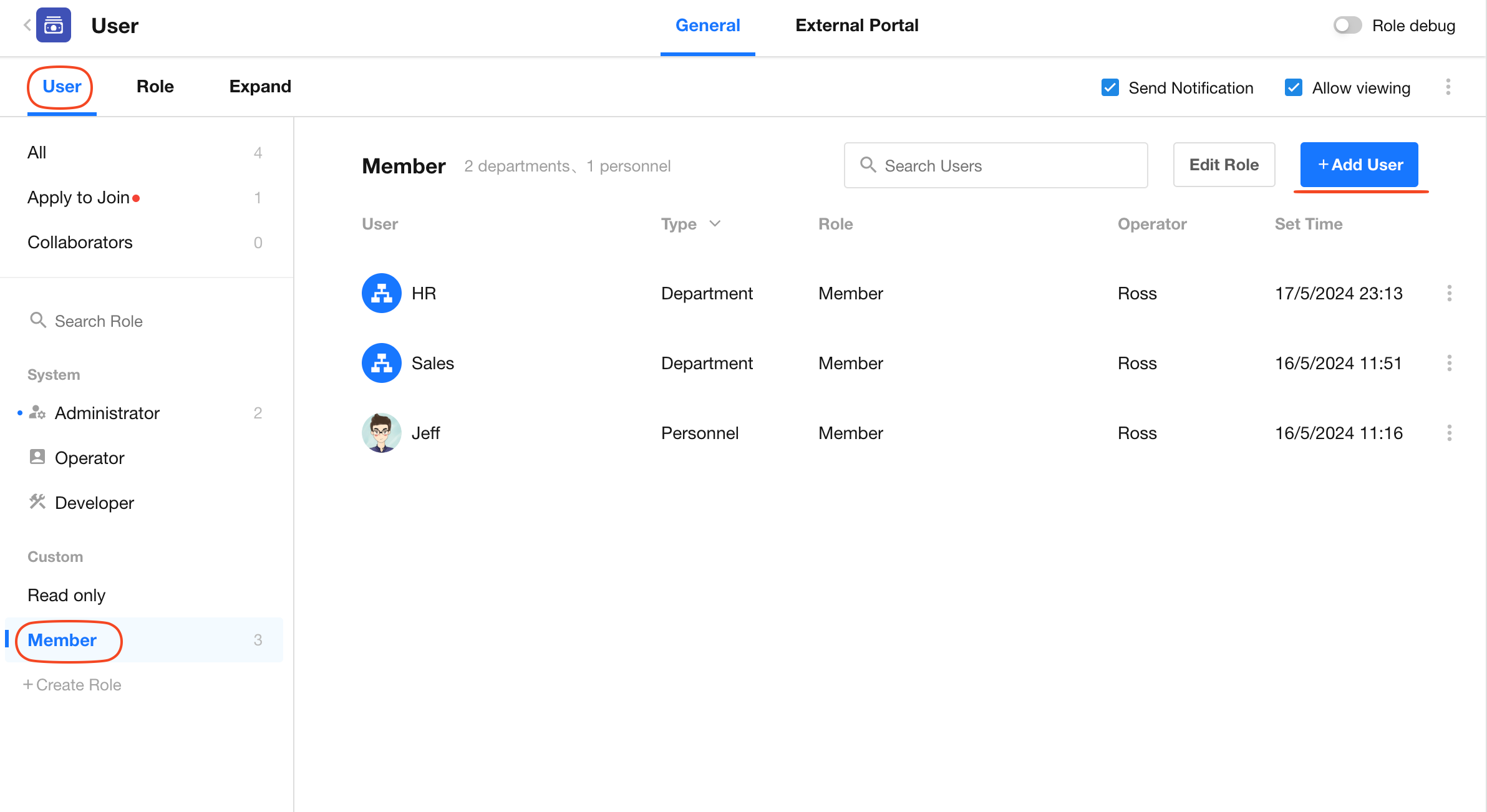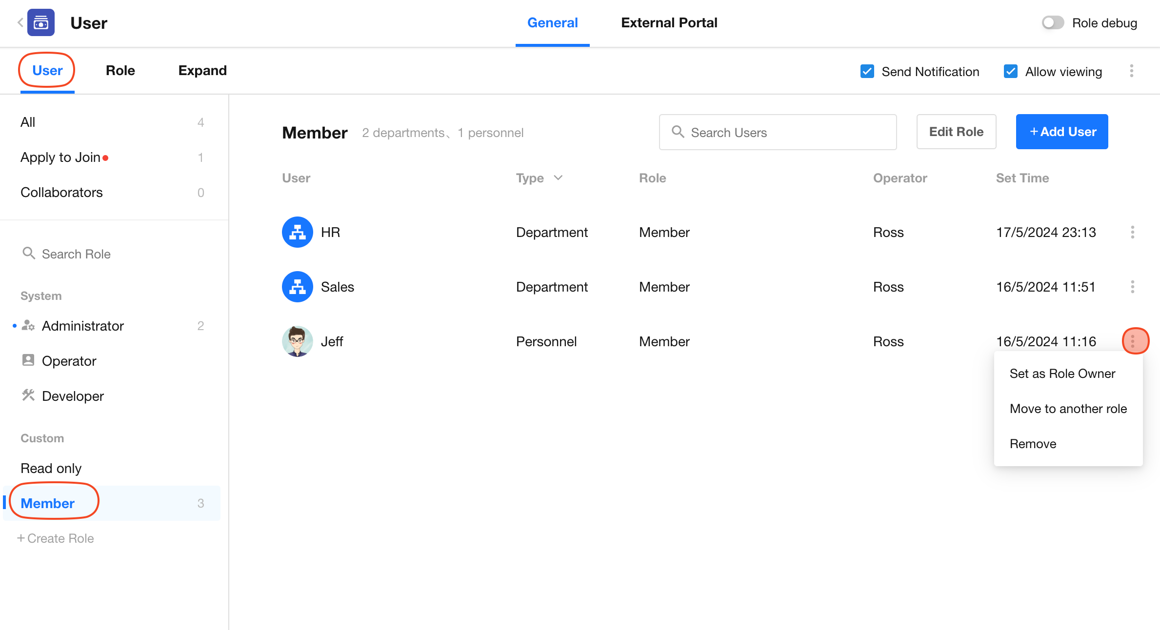 Once roles are configured, you can manage users under the User tab. Here, you can view all users, pending applicants, collaborators, or filter users by role.