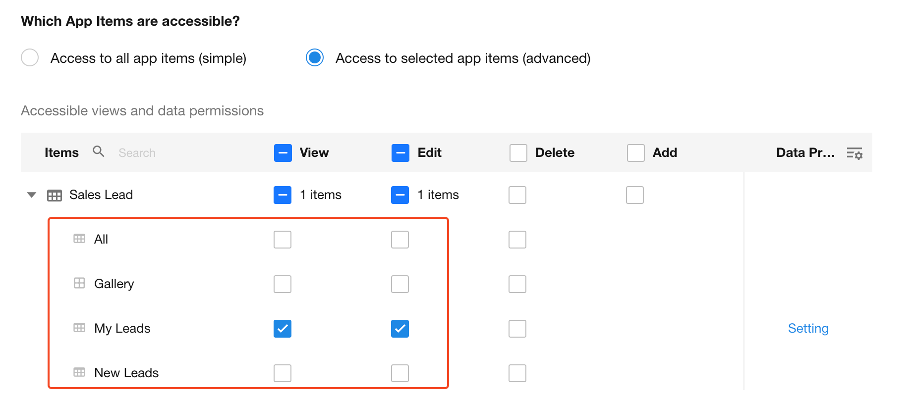 After assigning add/edit/delete permissions for records in views, you can refine which records within a view a user may operate on.