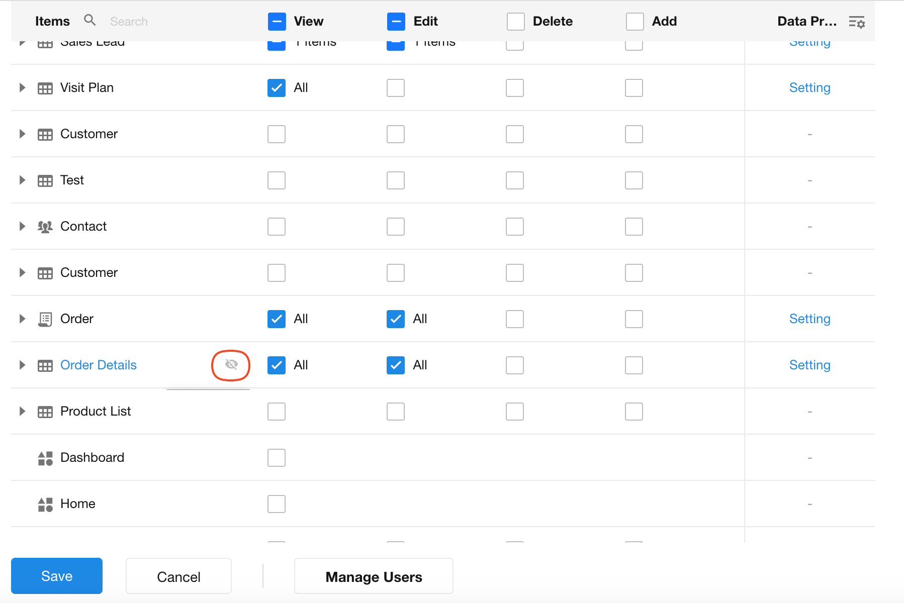There are four available permissions: View, Edit, Delete, Add.