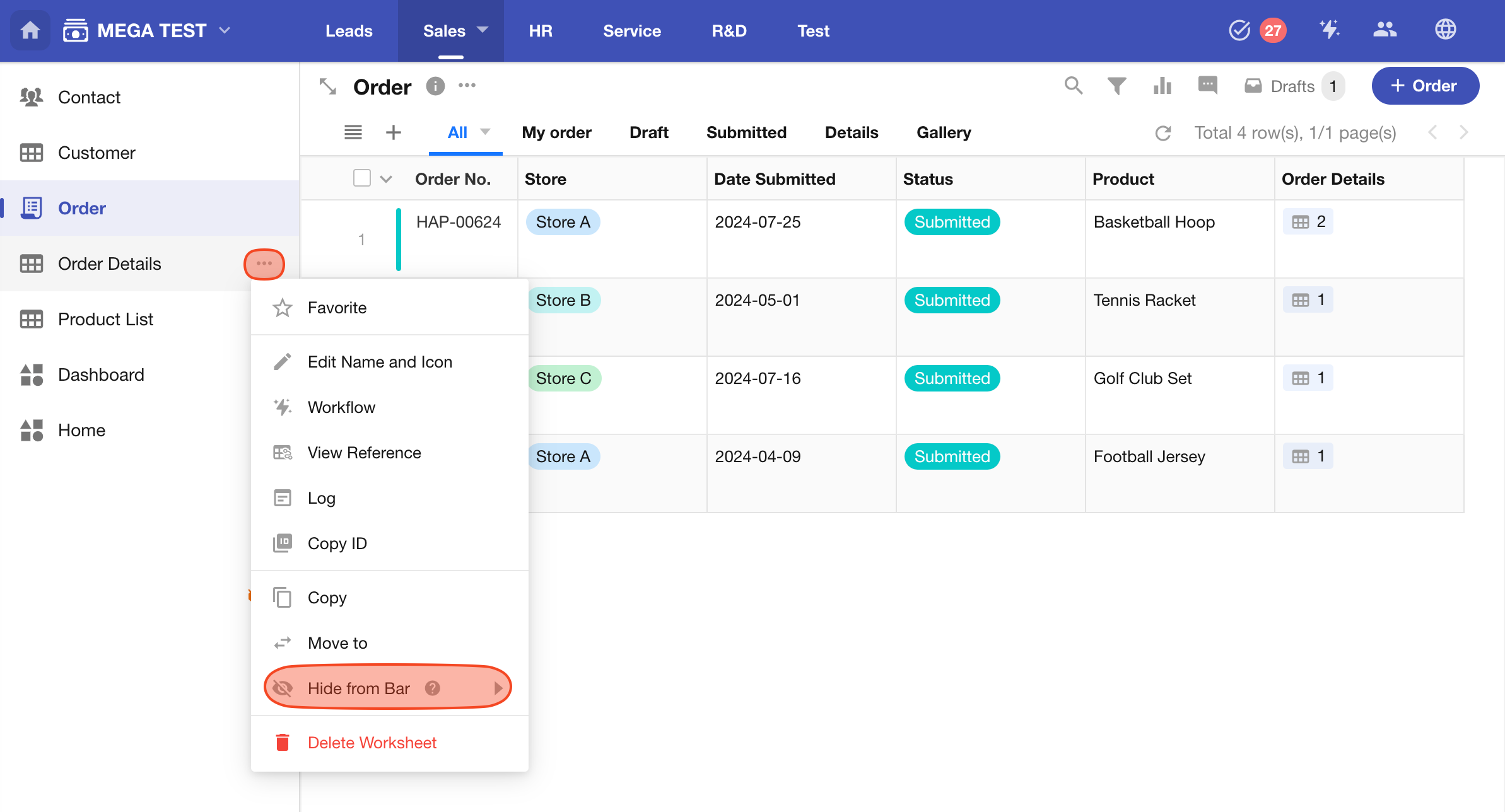 In many scenarios, worksheets like order details are accessed only through related records (e.g., from orders). To reduce clutter, you can hide these worksheets from the app navigation while still retaining access permissions.