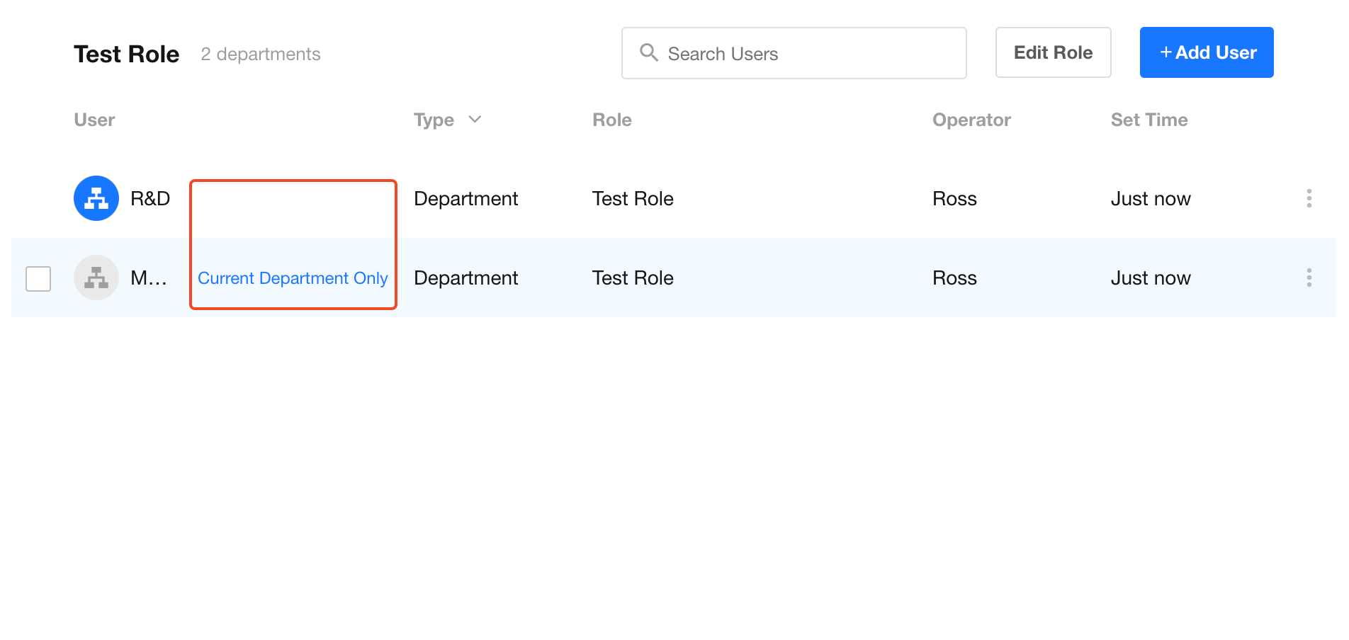 Adding a department to a role means all current members of that department inherit the role permissions. New members added to that department in the future will also automatically receive this role. The same applies when adding an organizational role or job title.