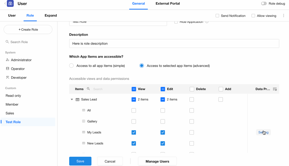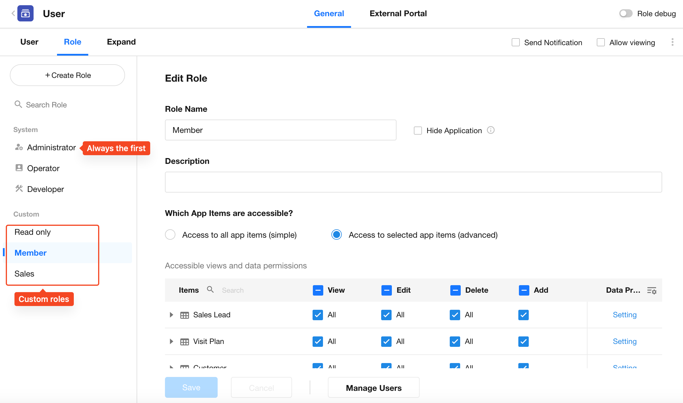 Administrators or Developers can create new roles and configure their members and permissions independently.