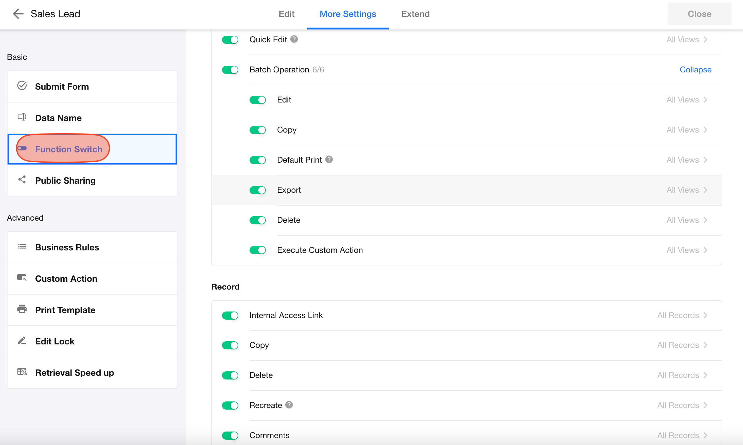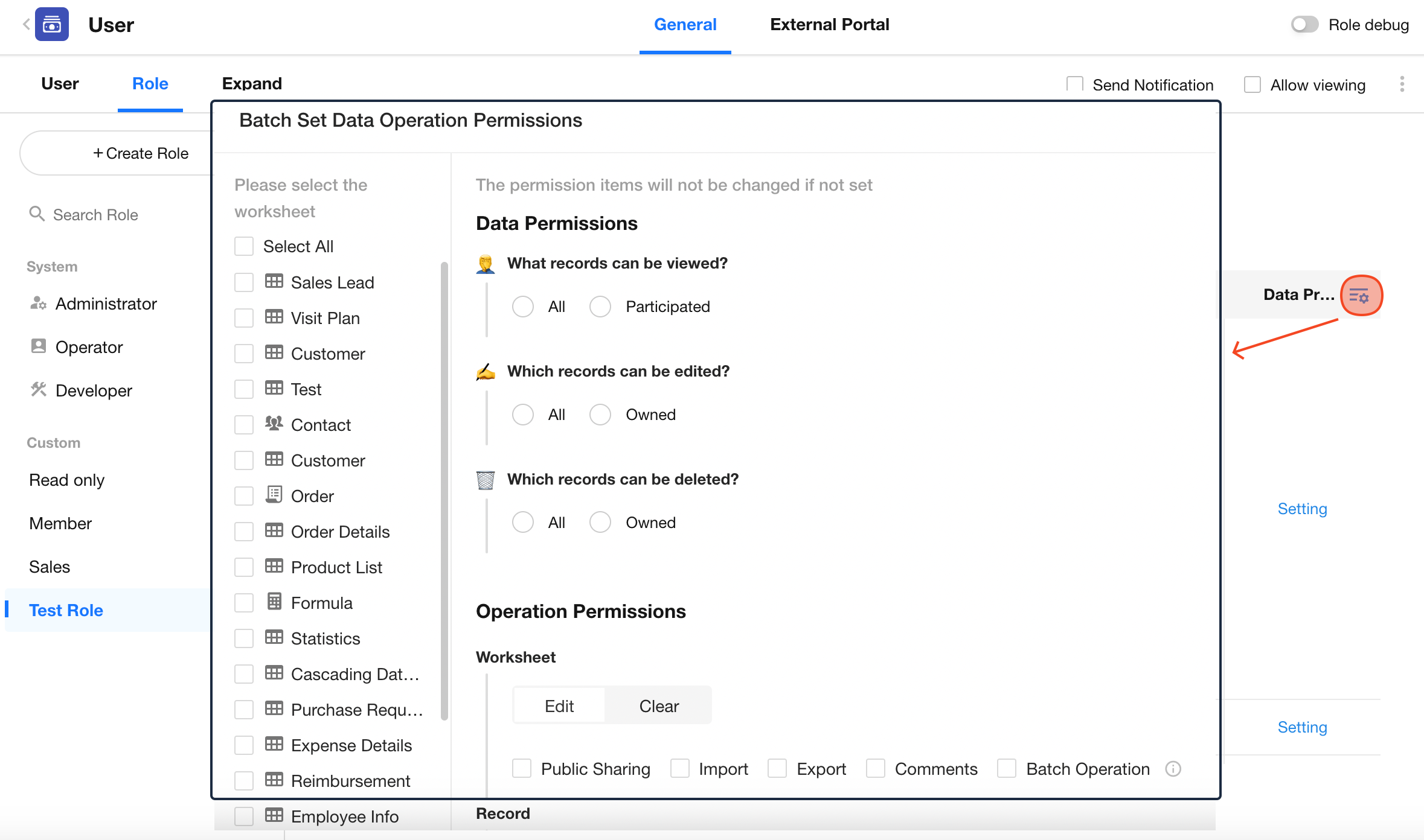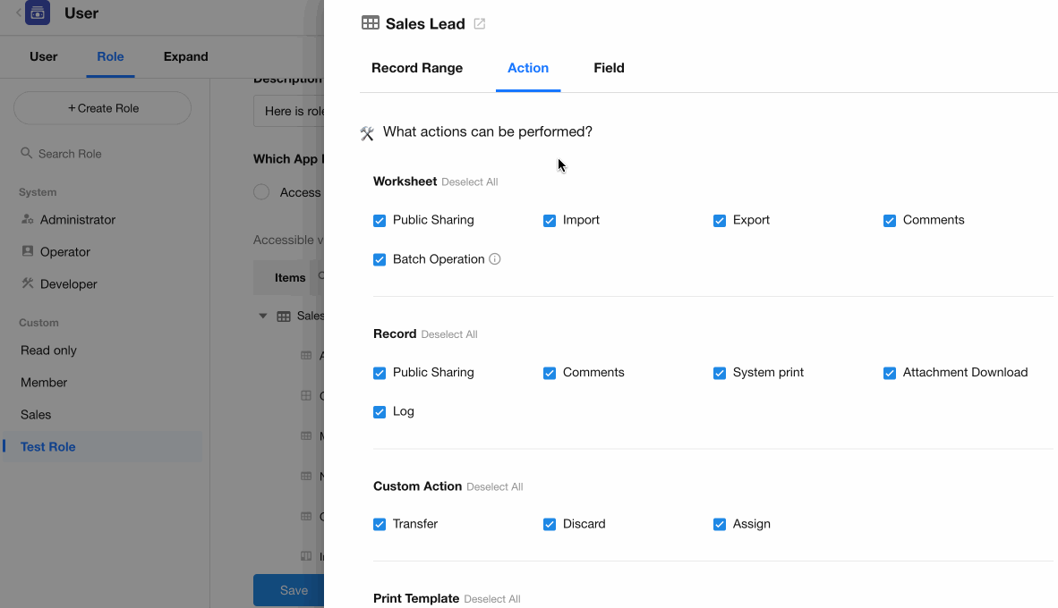 In addition to record permissions, you can configure common actions such as create, import, export, print, etc.