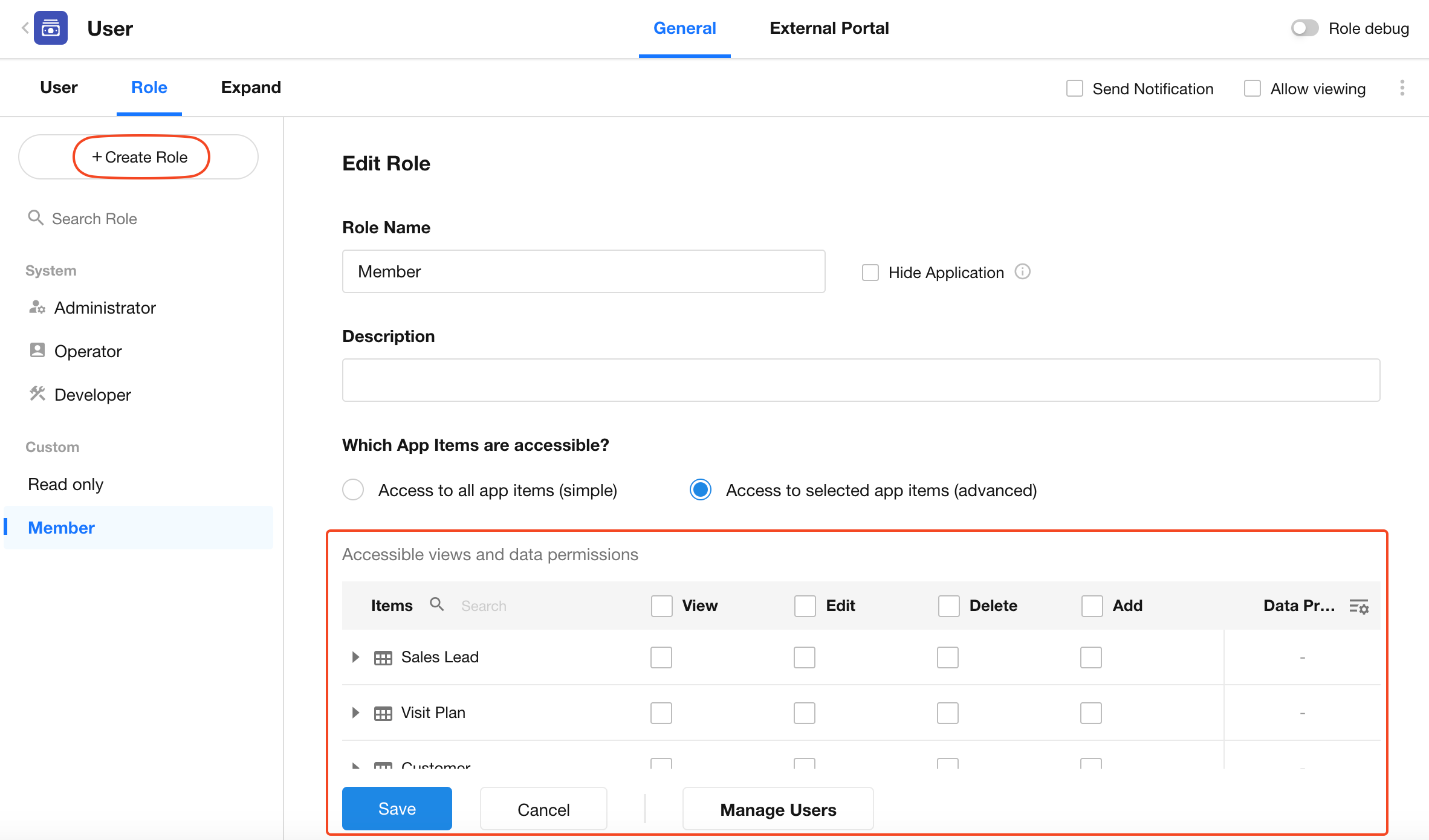 Application administrators can create new roles and configure their permissions. By default, each new app includes two predefined custom roles: Member and Read-Only. Admins can reconfigure these roles or create additional ones as needed.