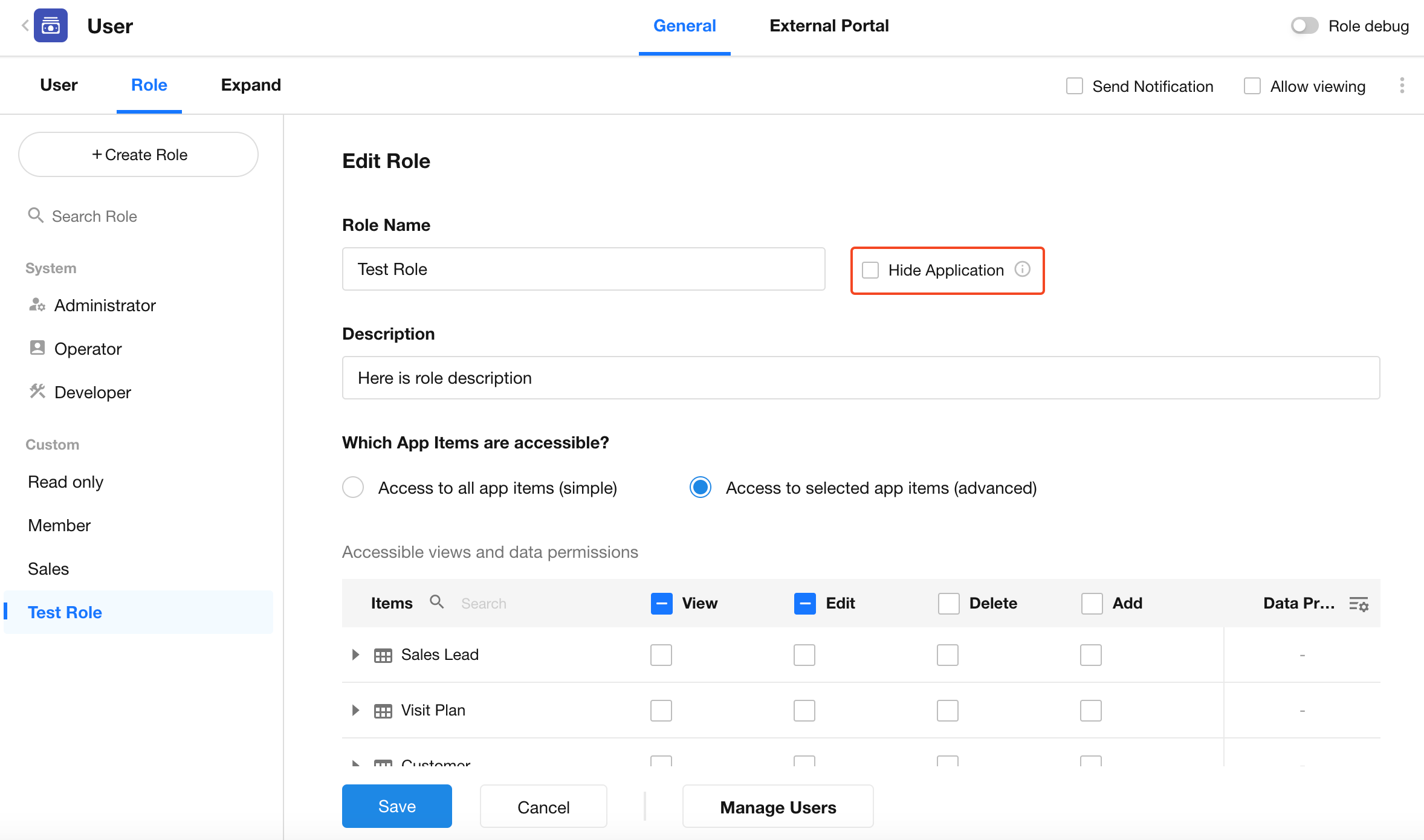 This is a quick and easy configuration mode. All custom pages, worksheets, and views in the application are visible to the role, and permissions are managed uniformly. Field-level permissions are not supported. This mode is suitable for apps with fewer users and roles.