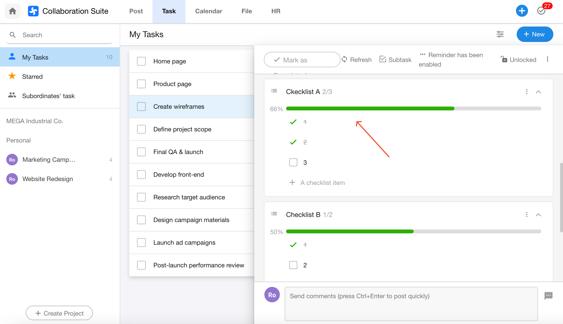 3. Check completed items. A progress bar will automatically appear at the bottom of the checklist showing progress.