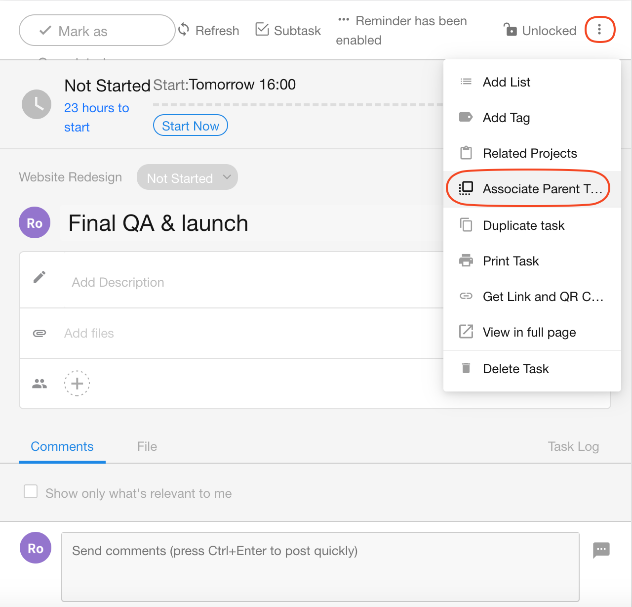 Open the task details page, click the More icon in the top right corner, then select Link Parent Task.